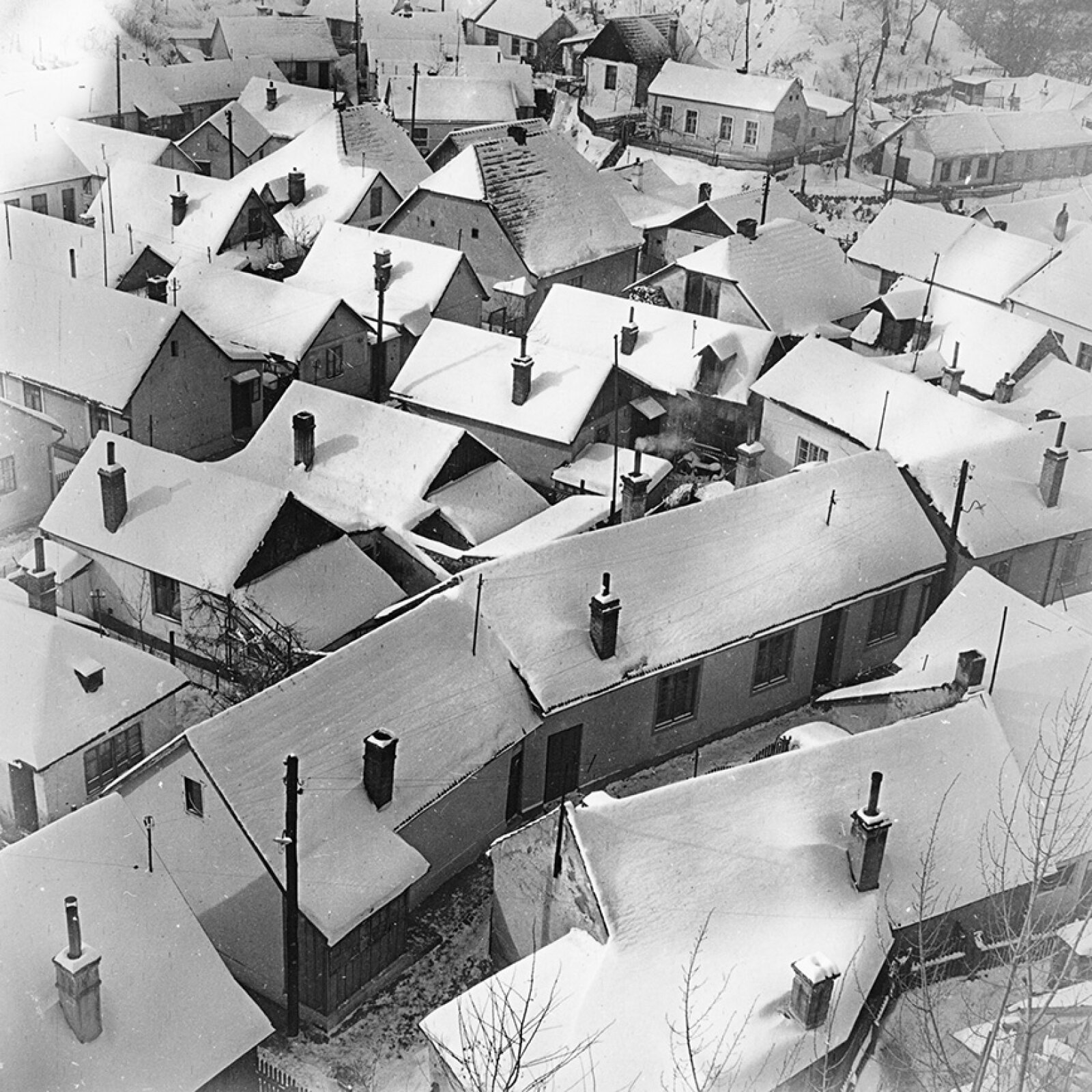 - Karel Otto Hrubý, snímek zasněžených střech Kamenné kolonie, leden 1947.