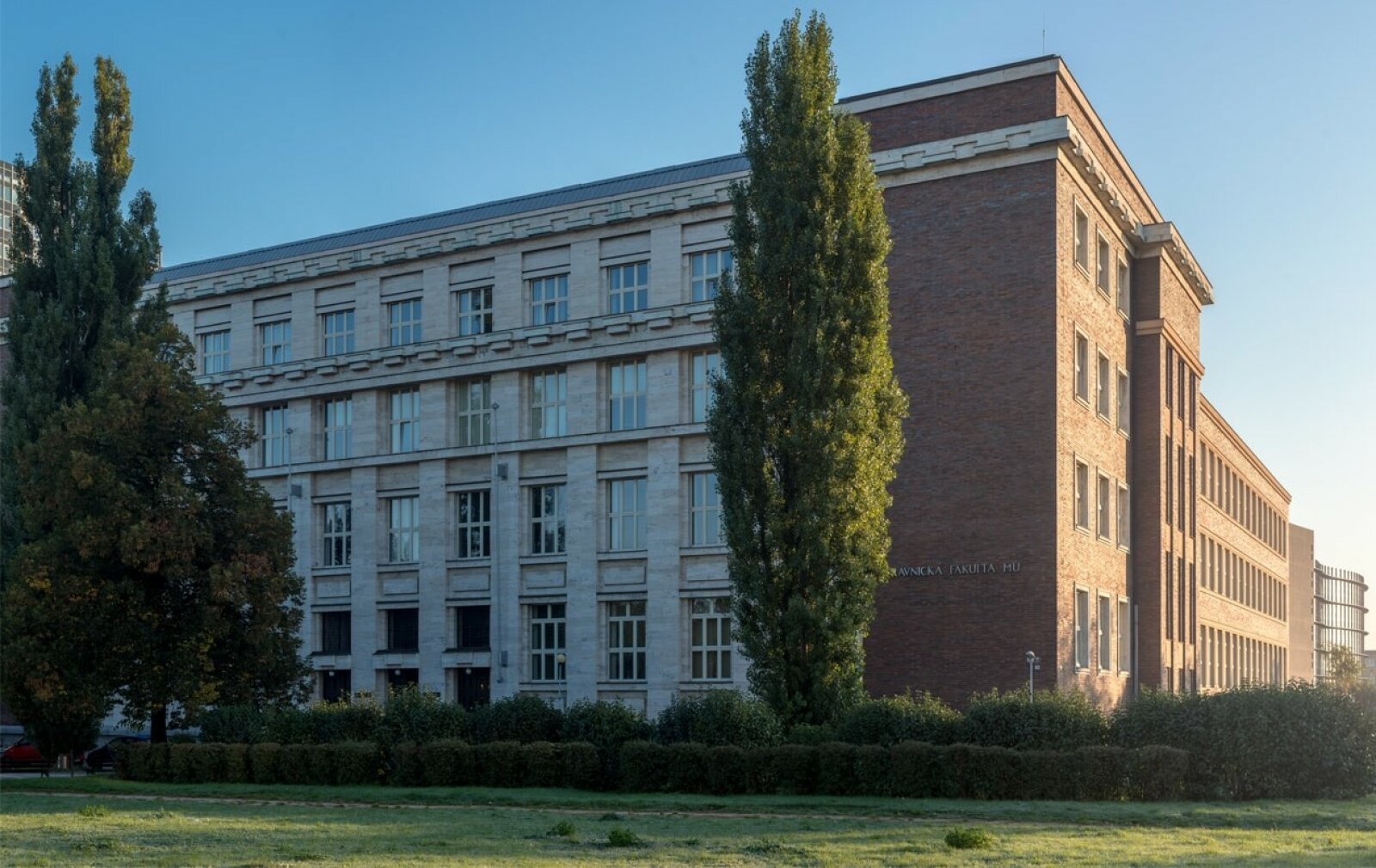 V květnu jsme připomněli 95. výročí otevření výstaviště v Brně-Pisárkách. Během první návštěvy prezidenta Masaryka na Výstavě soudobé kultury, 9. června 1928, byl za jeho přítomnosti slavnostně položen základní kámen ke stavbě brněnské právnické fakulty na Veveří ulici. Ta se měla stát prvním objektem nového akademického komplexu s náměstím, z jehož budování však kvůli hospodářské krizi sešlo. Právnická fakulta patřila s fakultami přírodovědeckou, lékařkou a filozofickou ke čtveřici zakládajících fakult Masarykovy univerzity v roce 1919 a své první provizorní sídlo našla v budově Biskupského alumnátu na Antonínské ulici (dnes rektorát VUT). Monumentální novoklasicistní stavbu na Veveří, dokončenou v roce 1932, navrhl pražský architekt Alois Dryák (1872–1932). Patřil k virtuózním kreslířům a jako žák Friedricha Ohmanna k vynikajícím představitelům české secese. Později se přiklonil ke konzervativnímu modernismu, avšak vždy s vynikajícím kompozičním řešením. Ačkoli nedosáhl proslulosti svých vrstevníků Jana Kotěry či Josefa Gočára a nepatřil k významným pedagogům ani k avantgardistům, jeho dílo je s odstupem času velmi ceněné, a to ve smyslu postmoderního vnímání tradicionalismu, ale i ve smyslu technického a výtvarného řešení. Skleněný strop auly brněnské právnické fakulty vyplňují vitráže Františka Kysely s citáty slavných osobností českých dějin (Hus, Komenský, Masaryk). Na čelní stěně je monumentální obraz o rozměrech 13 x 7,5 metru Prometheus přinášející lidstvu oheň od Antonína Procházky, který zde byl instalován na popud profesora lékařské fakulty a sběratele umění Otakara Teyschla v prosinci 1938, v těžkém období blížící se nacistické agrese. Po okupaci a uzavření vysokých škol se budova stala sídlem moravského zemského velitelství gestapa, které si zde mj. zřídilo bar, jehož stěny byly obloženy dýhami z makassarského ebenu, který odcizili Němci z vily Tugendhat. Po válce zabrala budovu Rudá armáda, ale právnická fakulta se tam později vrátila. Po komunistickém puči v únoru 1948 a po čistkách v profesorském sboru však byla v roce 1950 zrušena a budova sloužila Vojenské akademii. V roce 1969 byla brněnská právnická fakulta obnovena a umístěna do bývalé Cyrilometodějské záložny na Zelném trhu (dnes hotel Grandezza). Po roce 1989 se vrátila do své budovy na Veveří. Přes všechny složité historické peripetie se Dryákova stavba stala již v roce 1958 kulturní památkou a v uplynulých letech prošla postupnou renovací. V roce 2011 se z prostor někdejšího gestapáckého baru, který sloužil studentům jako fakultní menza, vrátily původní vzácné dýhy do restaurované vily Tugendhat. V roce 2014 byla dokončena obnova historické auly včetně restaurování Procházkova obrazu a v následujícím roce byla v suterénu budovy zrekonstruována fakultní knihovna.