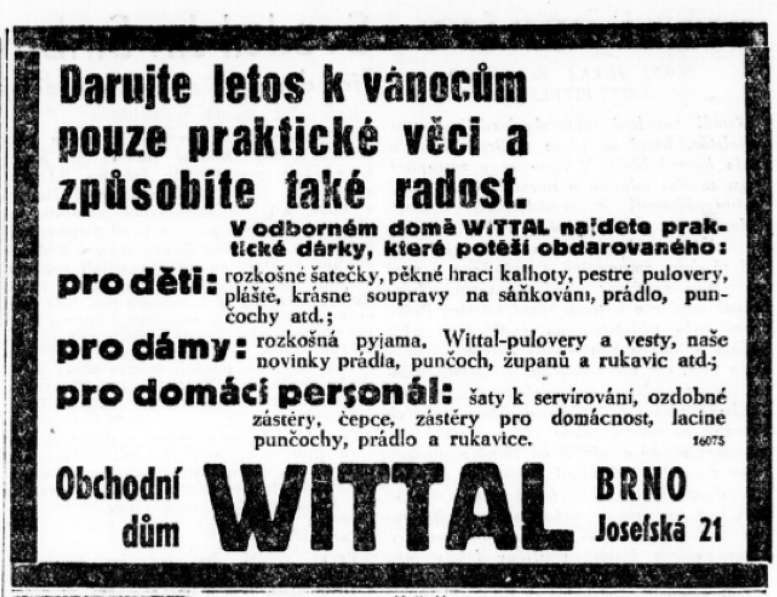 1929 – firma Brüder Wittal přesunula své sídlo a obchod na Josefskou 21 a současně rozšířila svoji nabídku o dětskou konfekci