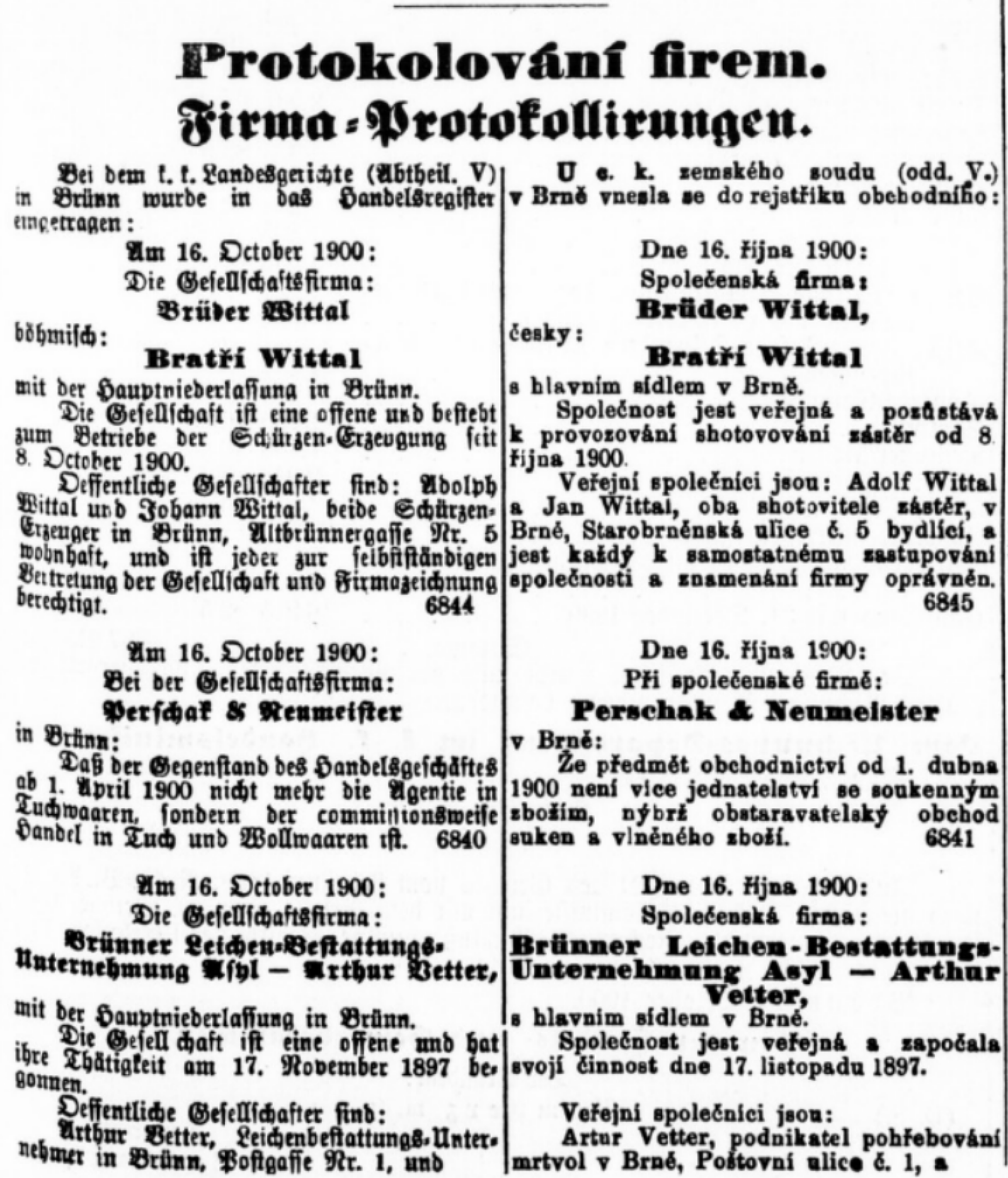 1. Informace o založení firmy Brüder Wittal. Brünner Zeitung, 20. 10. 1900