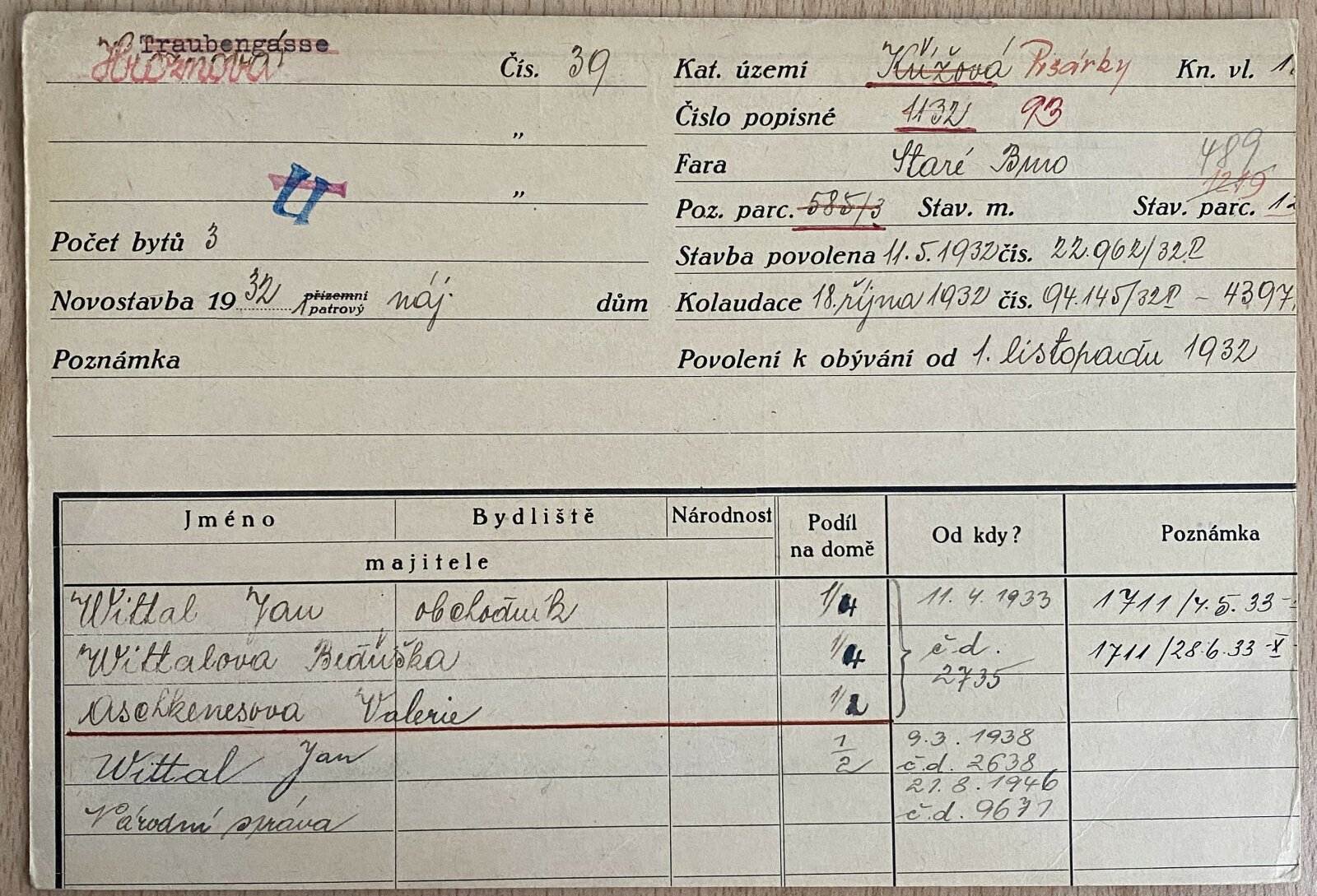 1932 – Johann a Friederike Wittalovi, spolu s dcerou Valerií, se stali majiteli pozemku na Hroznové ulici