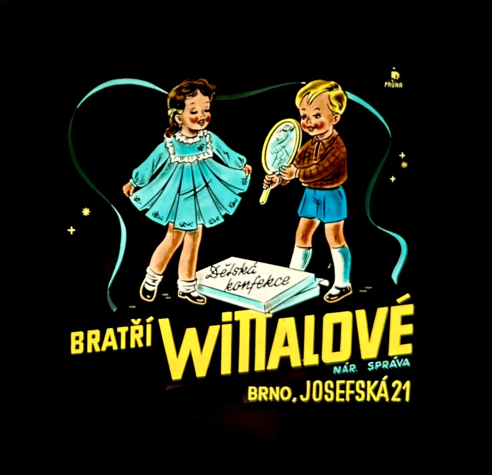 12. Reklamní skleněný diapozitiv určený k prezentaci firmy Bratři Wittalové v kinech. Vyrobil podnik Pruna Brno, asi 1946–1948. Moravský zemský archiv, fond H423 První brněnská výroba zástěr, halenek a sukní Bratří Wittalové