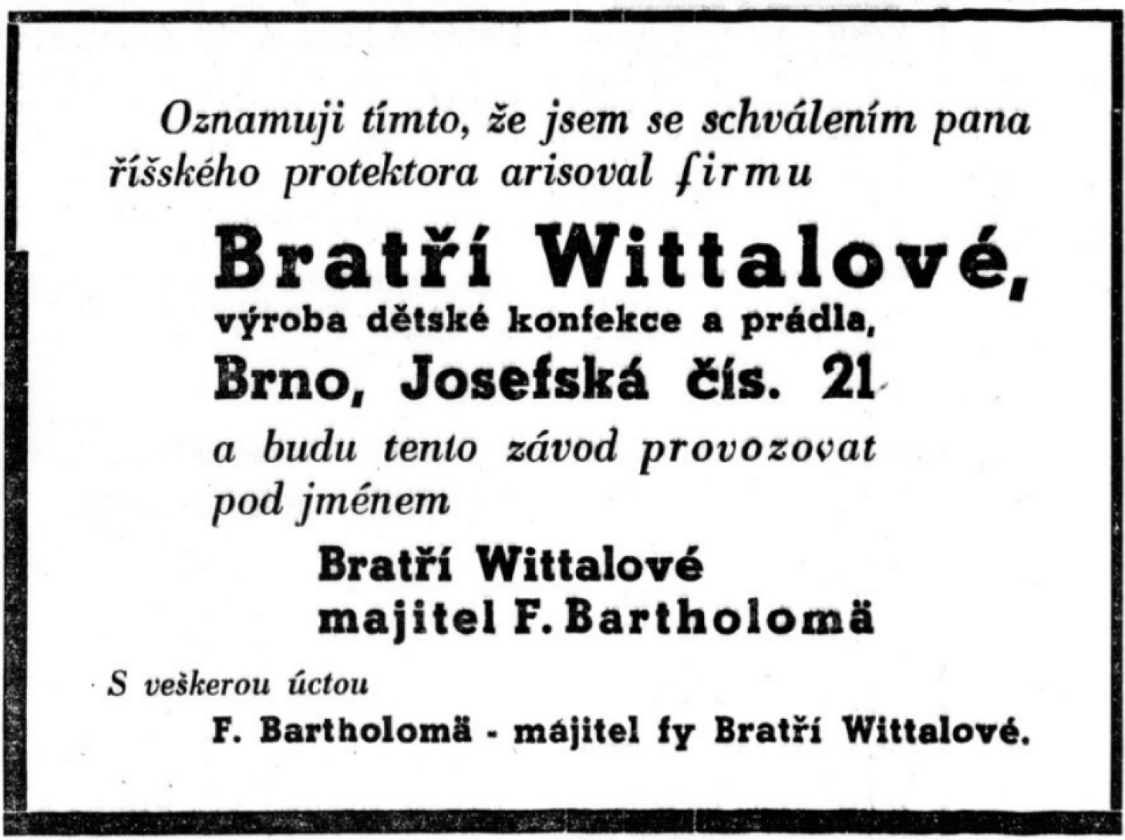 8. Informace o změně majitele firmy Brüder Wittal. Moravská orlice 3. 6. 1942