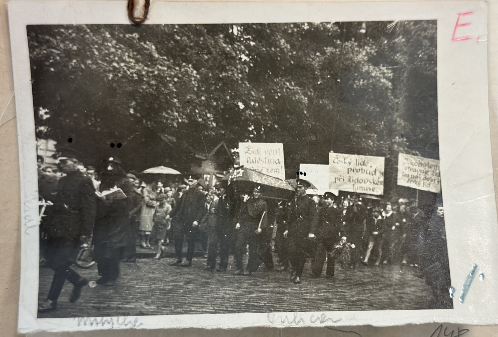 9. Jindřich Motyčka převlečený za židovského rabína na protižidovské demonstraci symbolizující pohřeb židovstva, jaro 1939. Jindřich Motyčka žil ve vile v letech 1941–1945. Moravský zemský archiv, fond C141, karton 143, signatura Lsp 120/46