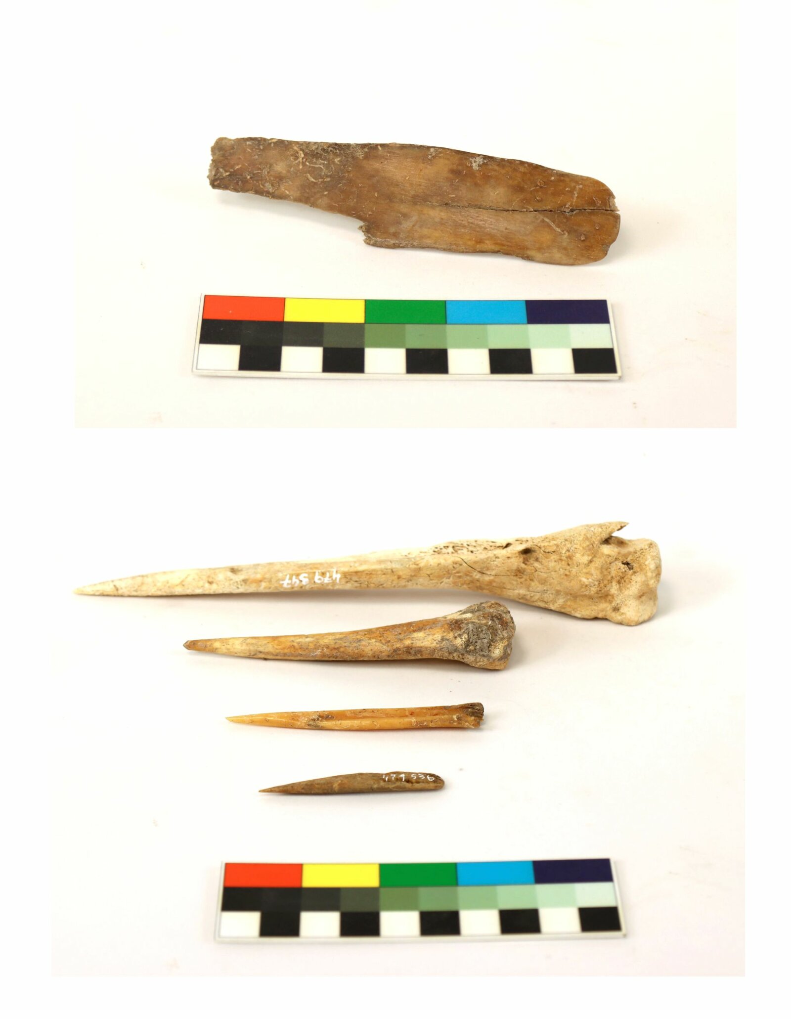 Kostěné nástroje. Nahoře hladítko na výrobu keramických nádob. Dole jehly a šídla.