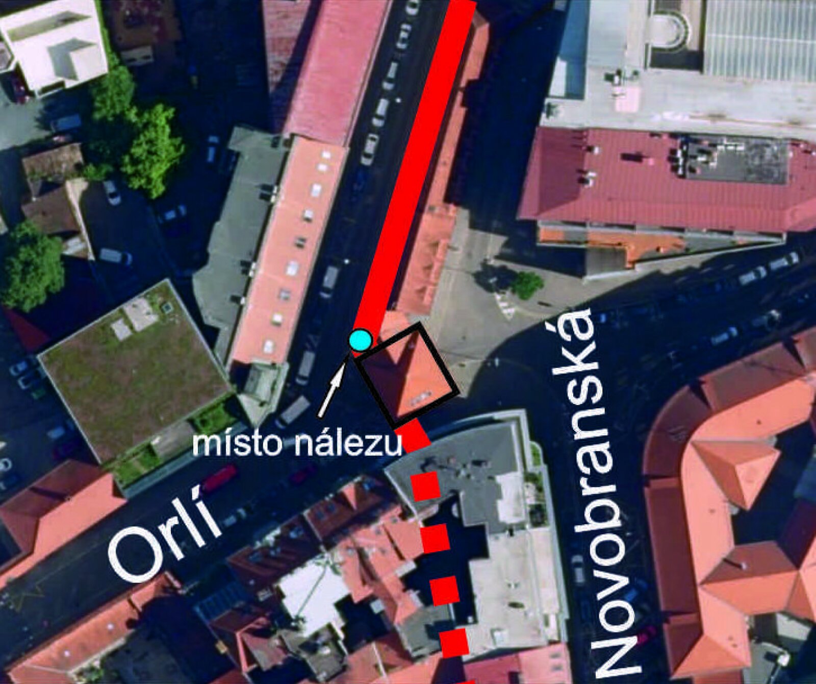 Obr. 2 - Měnínská brána na satelitním snímku s vyznačeným místem nálezu a původním průběhem středověké hradby.