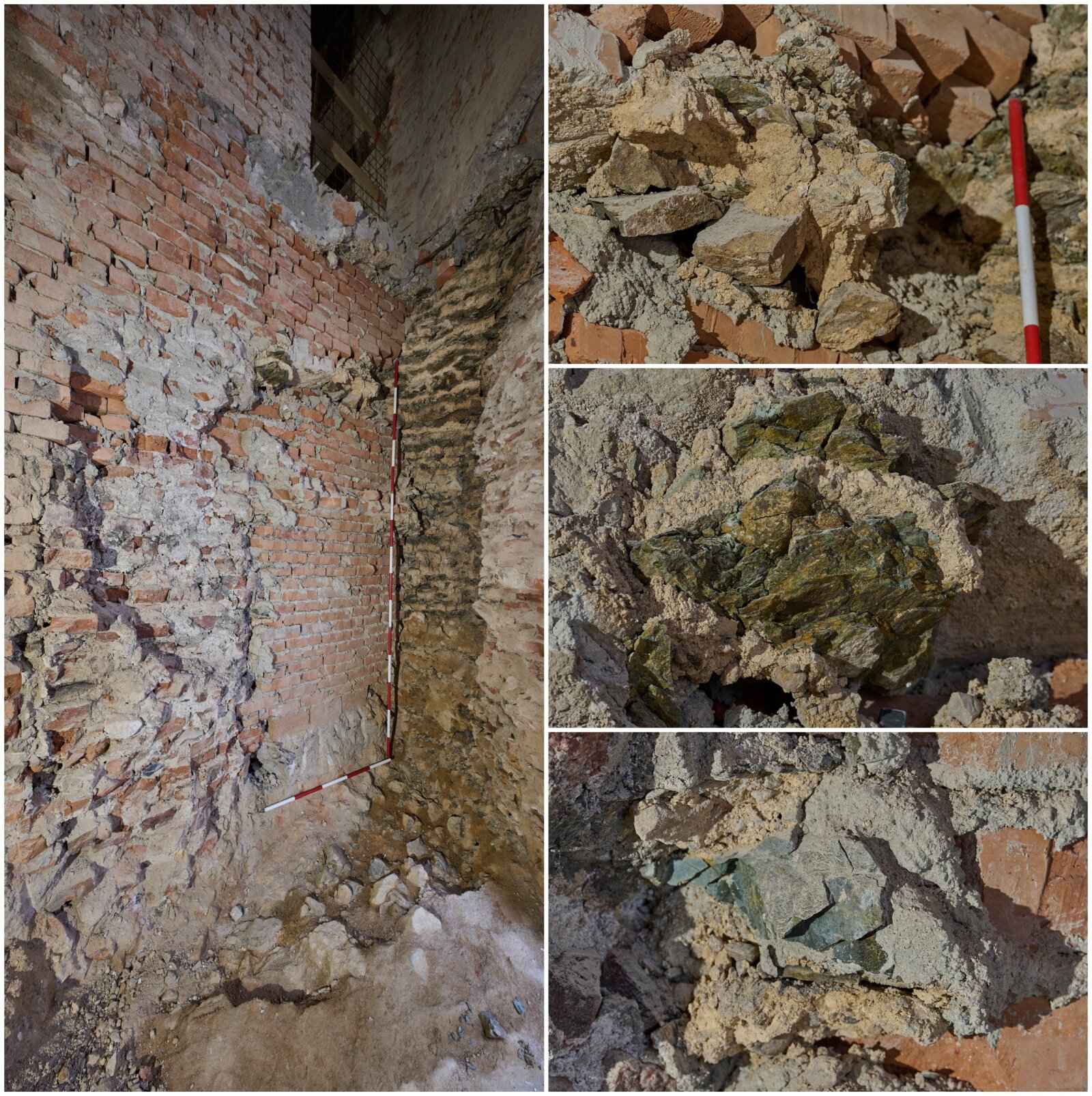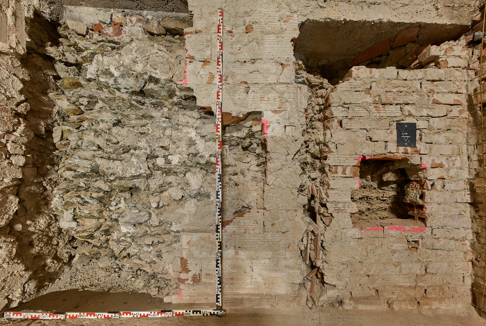 Obr. 1 – Nálezová situace zbytků středověké hradby ve výtahové šachtě. Tmavý kámen a žlutá malta ji viditelně odlišují od moderního cihlového zdiva.