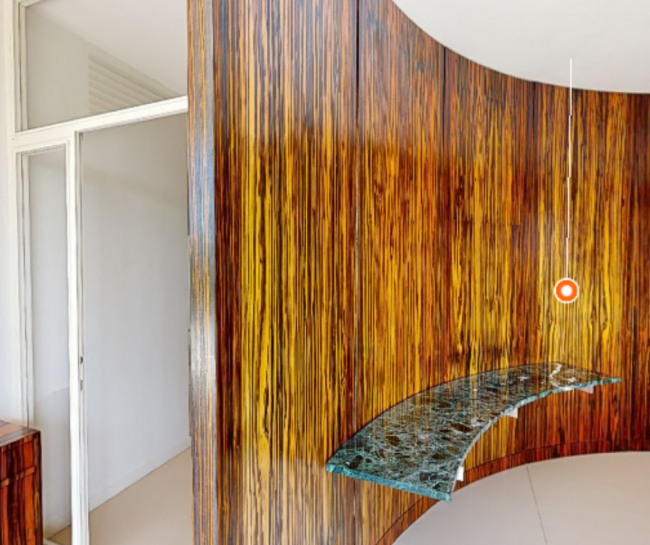 The load-bearing structure of the building consists of 29 cross-shaped steel columns. The main living room is designed as a flowing space. Its "flow" is gently directed by the straight line of the onyx and the curve of the macassar partitions in harmony with the regular rhythm of the supporting columns and the carefully spaced furniture.