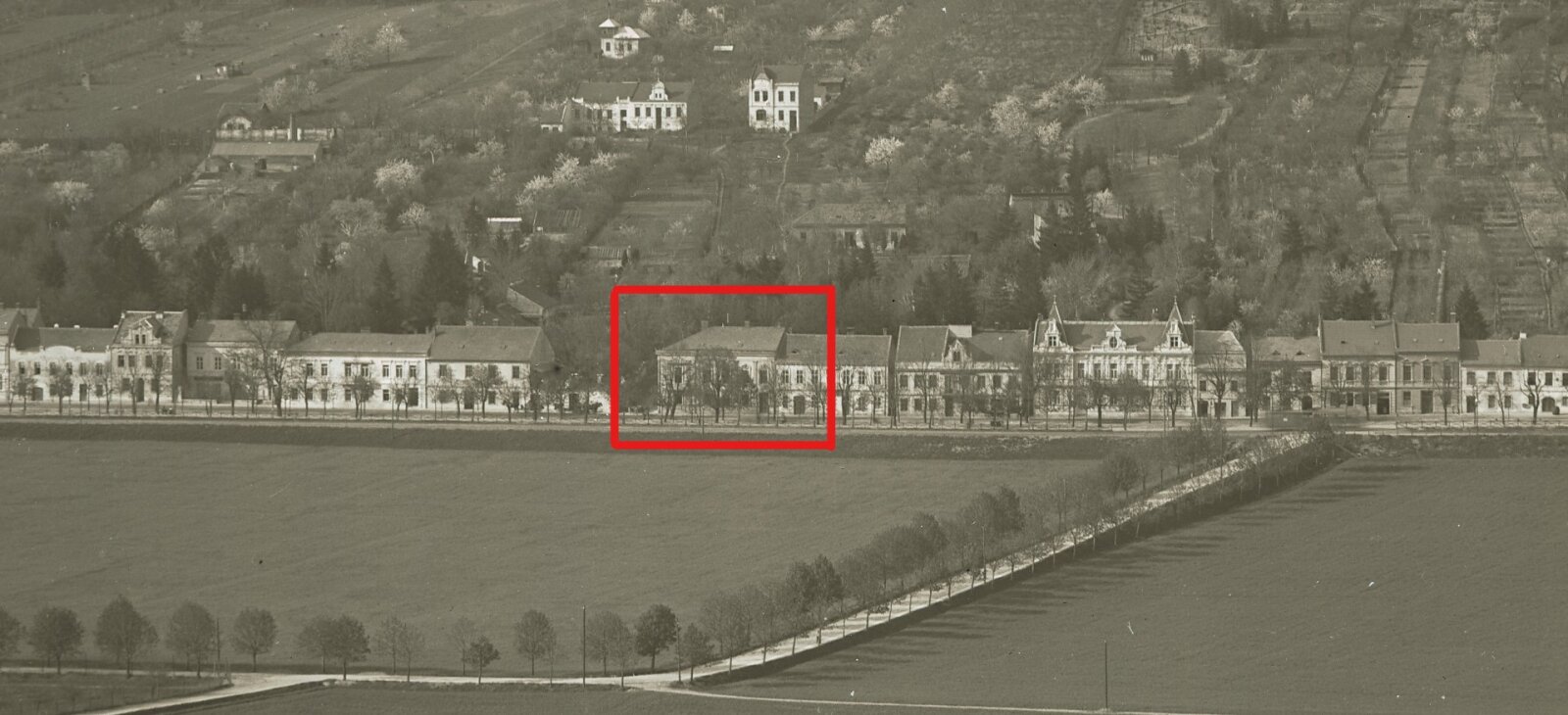 Obr. č.3: Výřez z panoramatické fotografie ulice Hlinky z roku 1911 s vyznačením původního domu Hlinky 92. Zdroj Muzeum města Brna