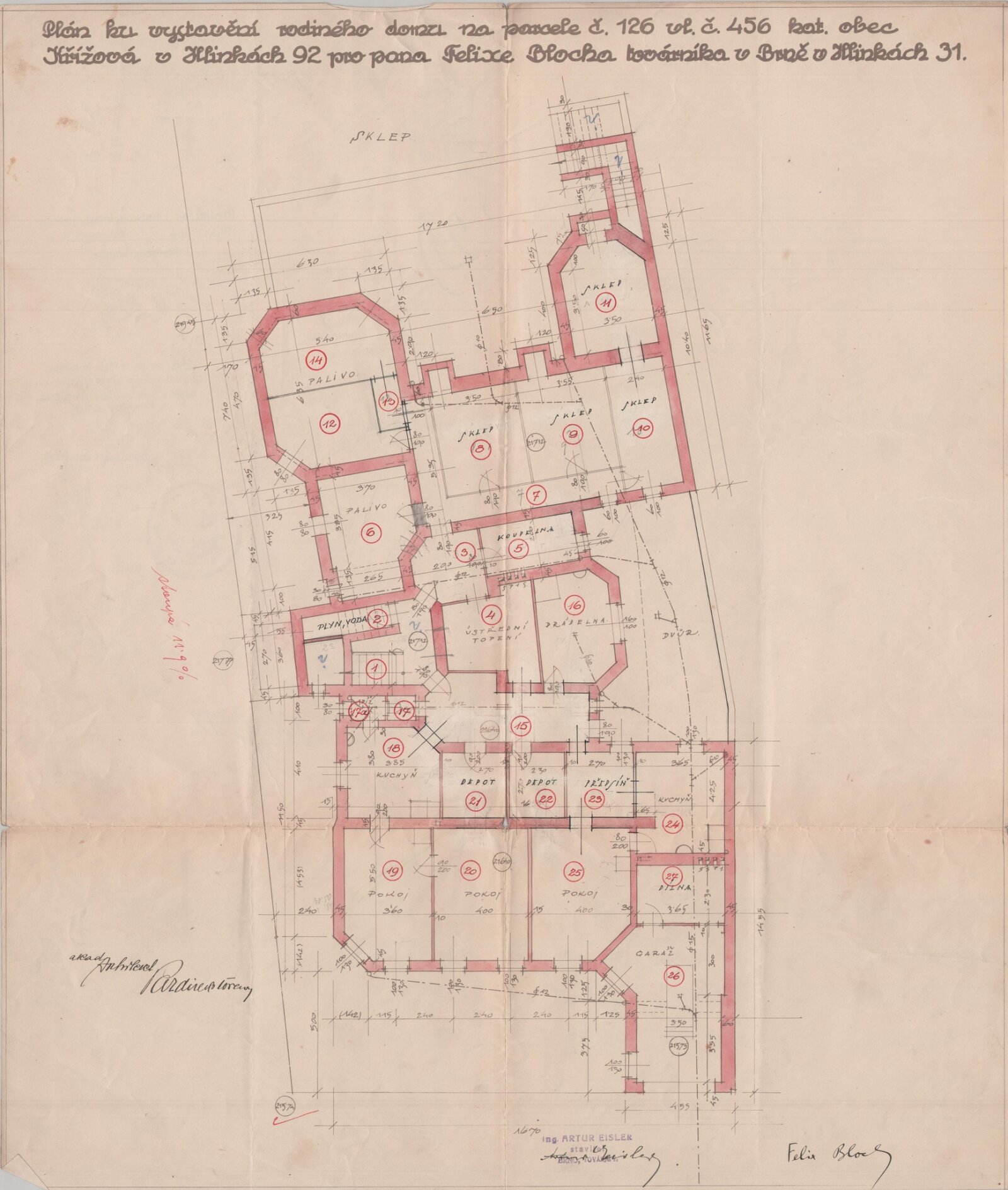 Stavební povolení udělila Felixu Blochovi městská rada v srpnu 1925:,,K žádosti ze dne 10. července 1925 uděluje se dle usnesení městské rady ze dne 18. srpna 1925 panu Felixu Blochovi v Brně, V hlinkách č. 31 na základě komisionelního řízení ze dne 28. července 1925 stavební povolení ku postavení dvoupatrového domu se čtyřmi byty na místě domu V hlinkách č. 92, dle předloženého nákresu…“ Dokumentace onoho nového domu, označená jako „Plán ku postavení rodinného domu na parcele číslo 126, vl. č. 456 kat. obce Křížová v Hlinkách 92 pro pana Felixe Blocha továrníka v Brně v Hlinkách 31“, je datována do července 1925 a dochovala se v Archivu města Brna. Dokumentace je v tomto případě cenná, neboť umožňuje identifikovat jak projektanta, tak i firmu, která byla stavbou pověřena. Kromě podpisu stavebníka Felixe Blocha, tak výkresy obsahují razítko stavebního podniku Artura Eislera, a také signaturu ,,Akad. Architekt Pazdirek-Coreno“.