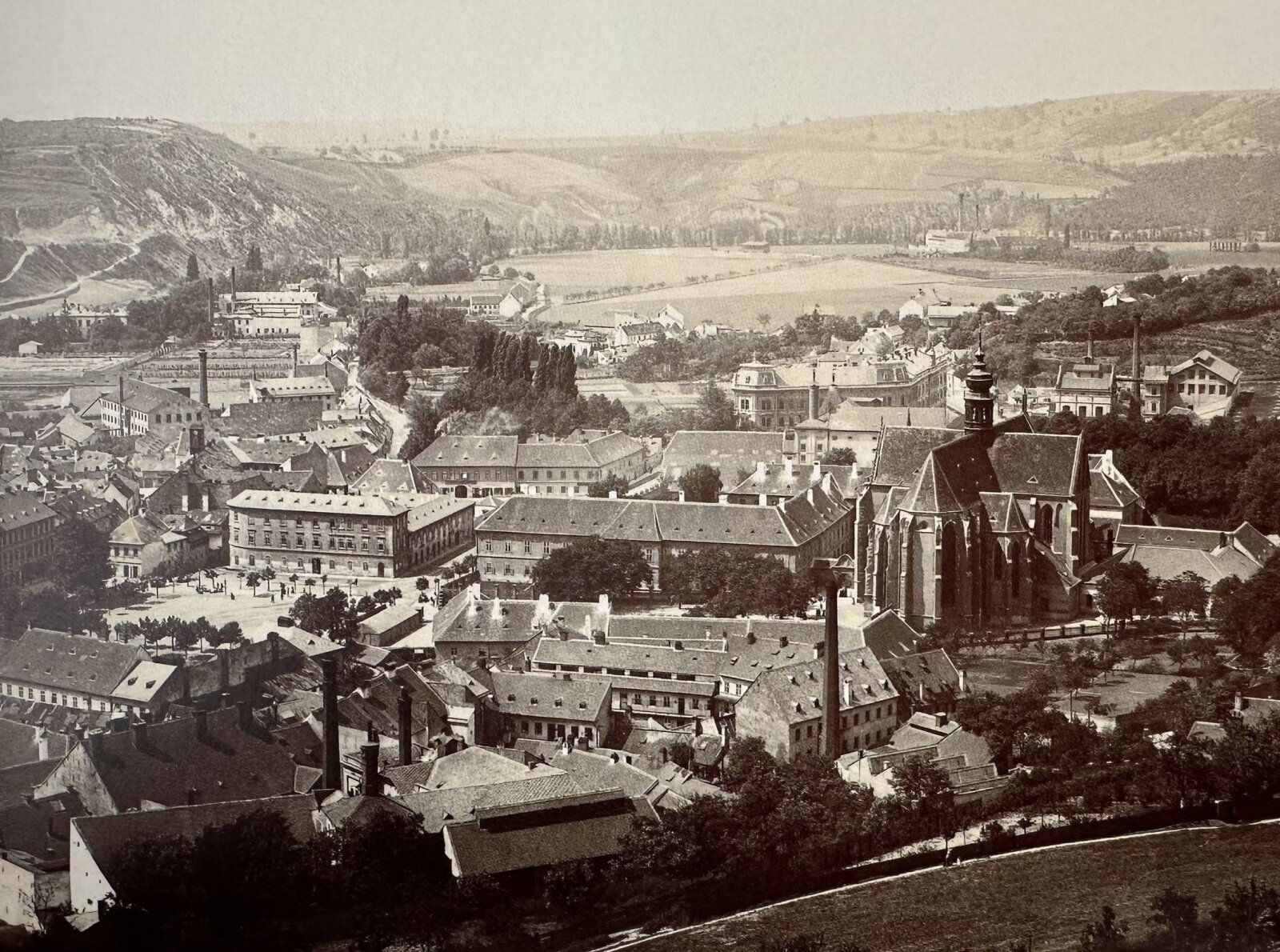 Obr. č.2: Pohled na Staré Brno na konci 19. století se zachycením továrny E. Bloch et Söhne na Rybářské ulici. Zdroj Archiv města Brna