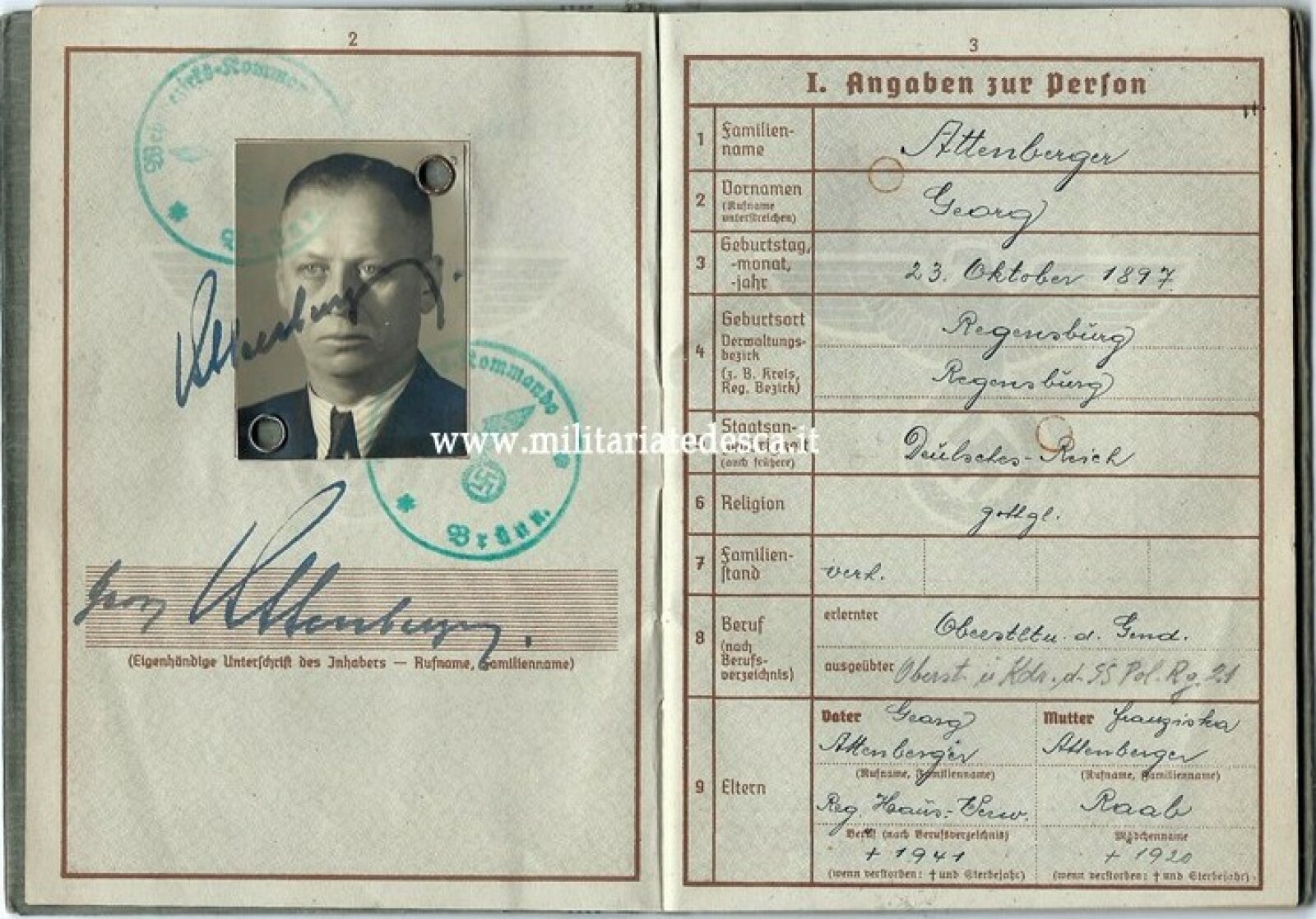 Obr. č.33: Wehrpaß SS-Standartenführera a Oberst der Gendarmerie Georga Attenbergera. Zdroj militariatedesca.it
