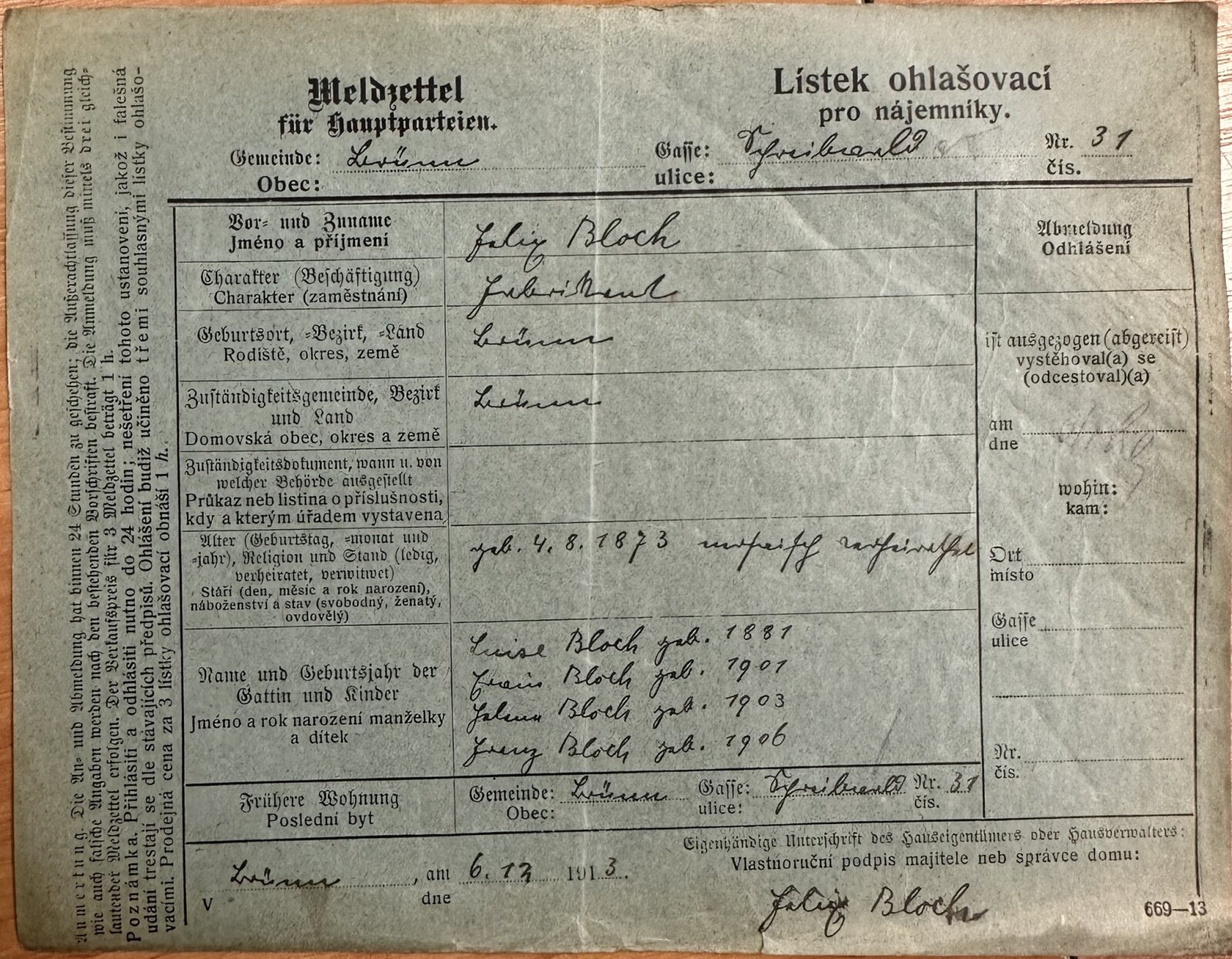 Obr. č.32: Ohlašovací lístek Felixe Blocha z roku 1913. Zdroj Archiv města Brna