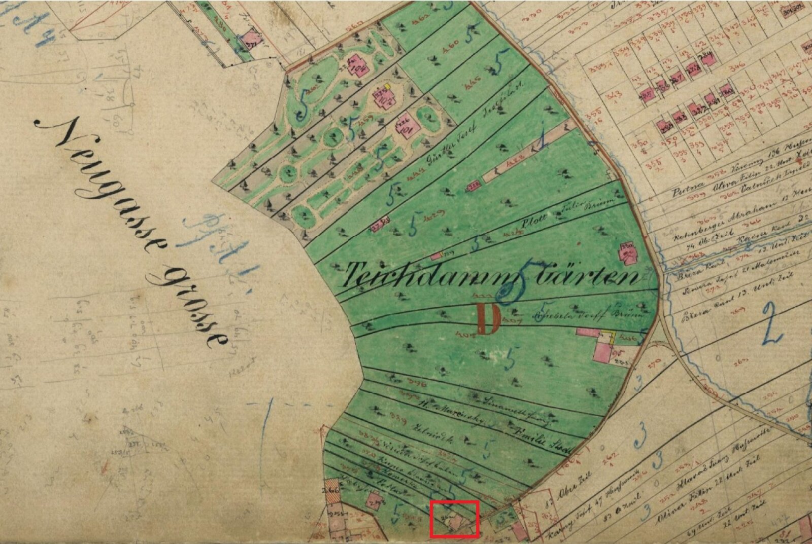Obr. 1: Indikační skica z roku 1876 s vyznačením vily Franze Foltase