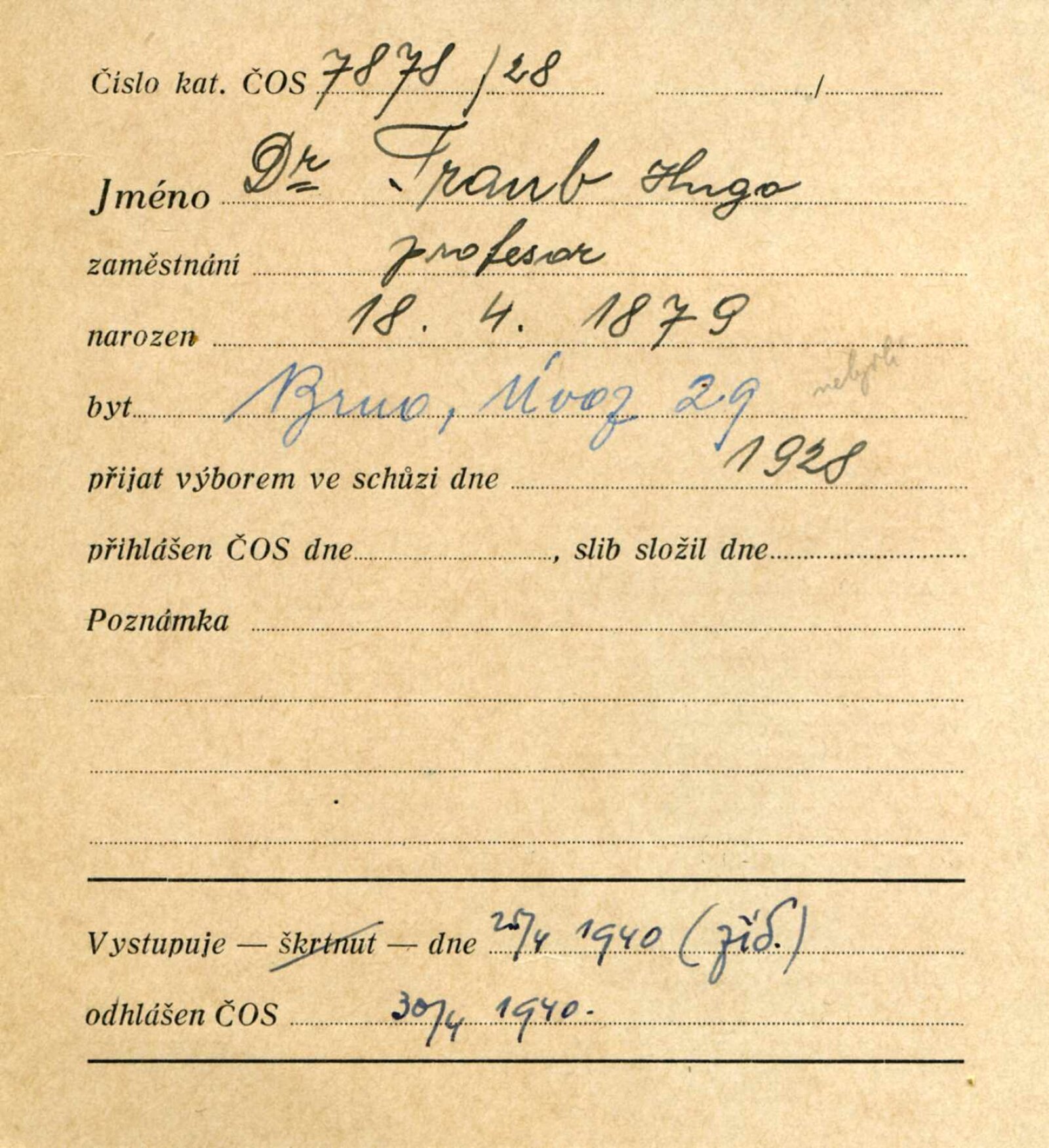 Obr. č.31: Karta Hugo Trauba o vyškrtnutí ze Sokola Brno I z 30.4.1940. Zdroj Archiv města Brna, fond R77