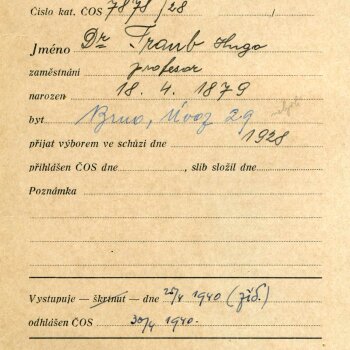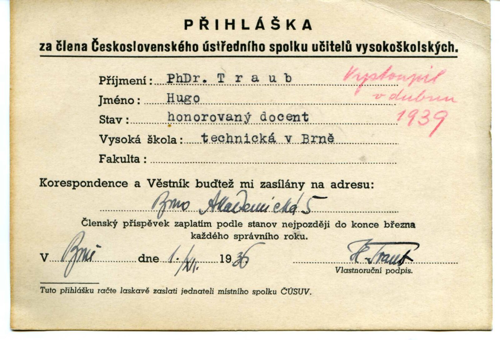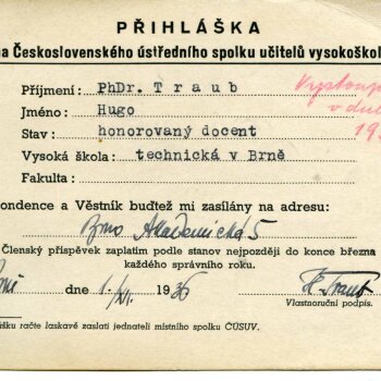 Obr. č.32: Přihláška Hugo Trauba za člena československého ústředí vysokoškolských učitelů. Zdroj archiv VUT