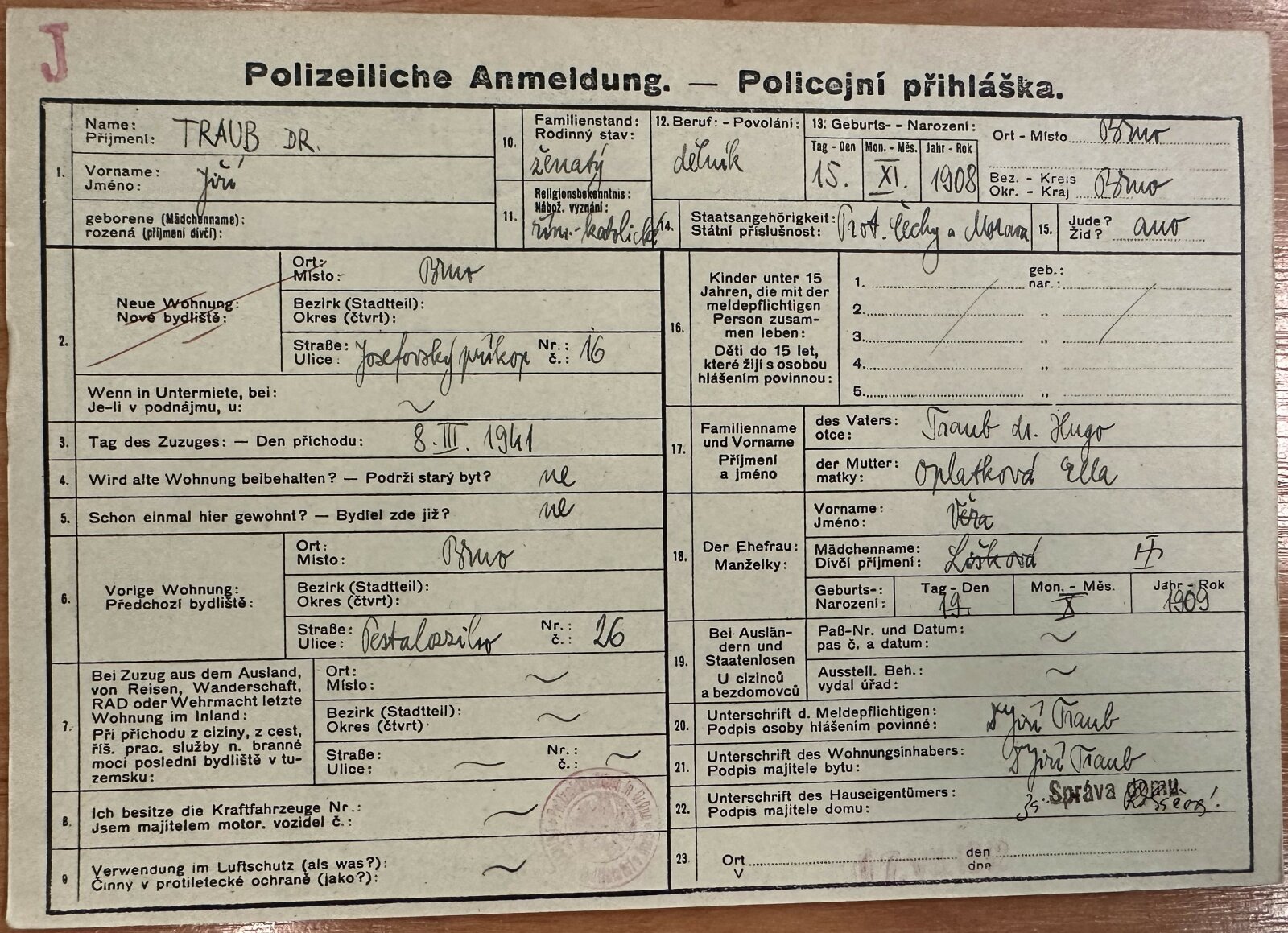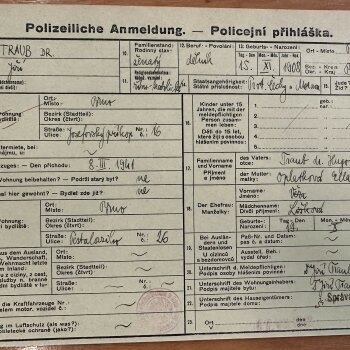 Obr. č.33: Policejní přihláška Jiřího Trauba z roku 1941. Zdroj Archiv města Brna