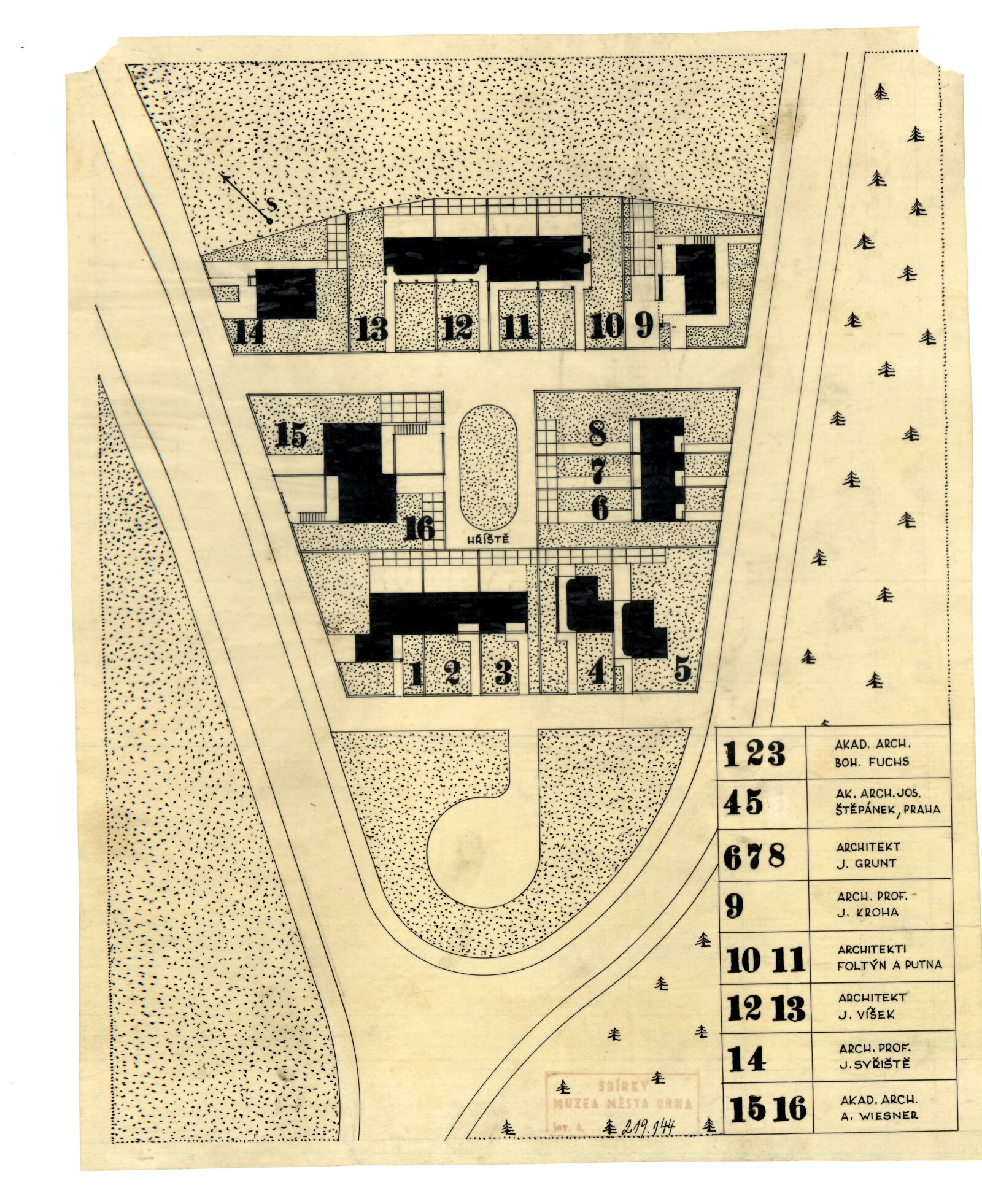 Osm brněnských architektů a jeden pražský navrhli 16 řadových nebo samostatně stojících rodinných domů dle zastavovacího plánu Bohuslava Fuchse a Jaroslava Grunta, z nichž každý navrhl v kolonii trojdům. Autory dvojdomů byli Josef Štěpánek (z Prahy), Jan Víšek a Ernst Wiesner, samostatné domy navrhli Jiří Kroha, Jaroslav Syřiště, Hugo Foltýn a Miroslav Putna (Foltýn a Putna byli ještě studenty architektury na brněnské technice). Stavitelé požadovali nepodsklepené domy na pilířích (vysoká spodní voda v lokalitě), hospodářské přízemí, dvě obytná patra s rovnou střechou (terasou), racionální půdorys, vestavěný nábytek, typizovaná okna a dveře. S výjimkou cihlového domu od Jaroslava Syřiště měly ostatní objekty nosnou železobetonovou kostru s výplňovým zdivem. Cílem měl být úsporně dimenzovaný typ domu s úplným technickým a hygienickým komfortem, uzpůsobený pro hromadnou výstavbu a určený převážně pro střední sociální vrstvy (Krohův dům se již blížil vilovému objektu).