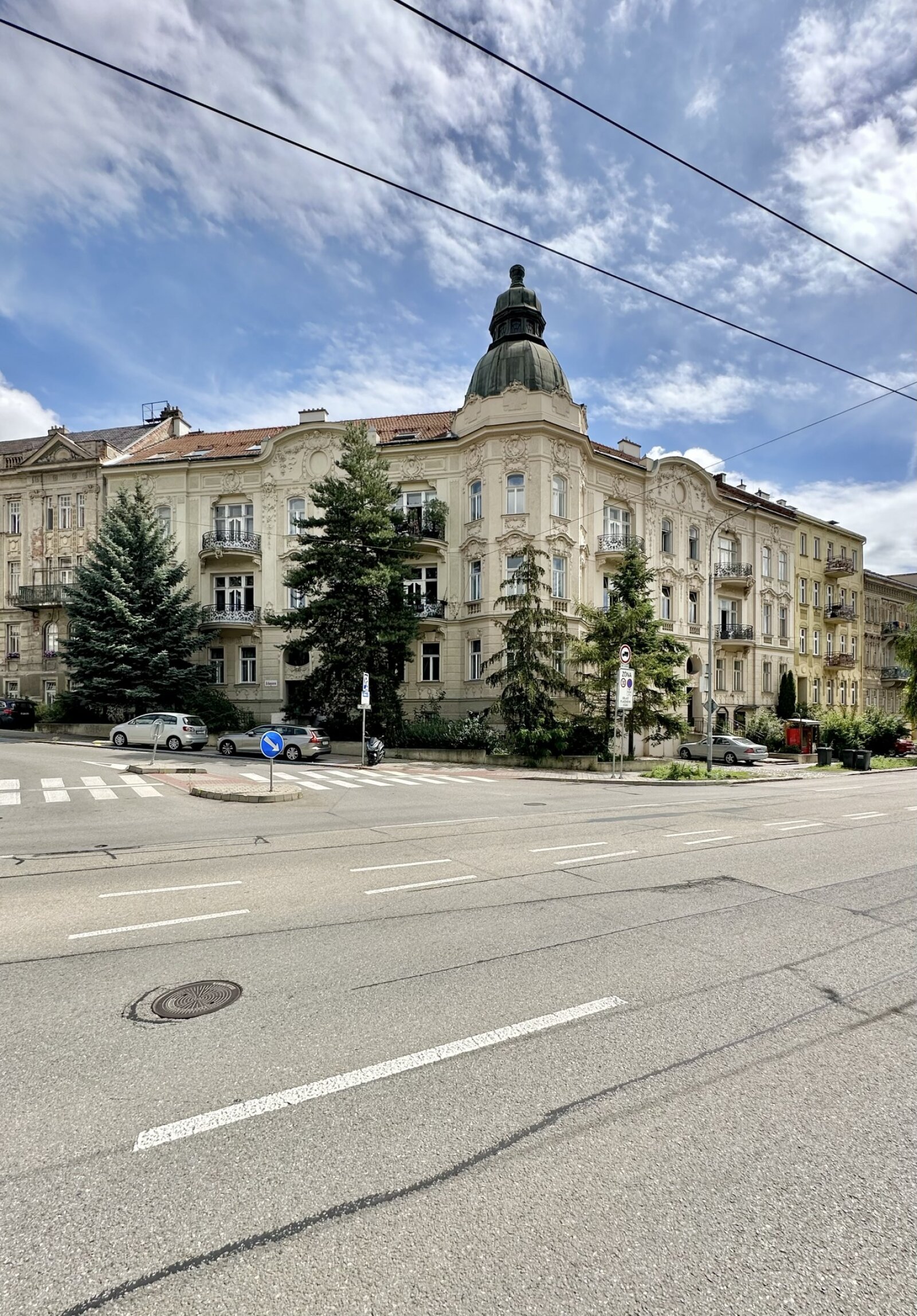 Podle projektu stavitele Arnolda Pawlu - syna výrazného brněnského stavitele přelomu 19. a 20. století Franze Pawlu - vyrostl v roce 1908 na nároží dnešních ulic Drobného a Erbenovy monumentální nájemní dům v secesním stylu.