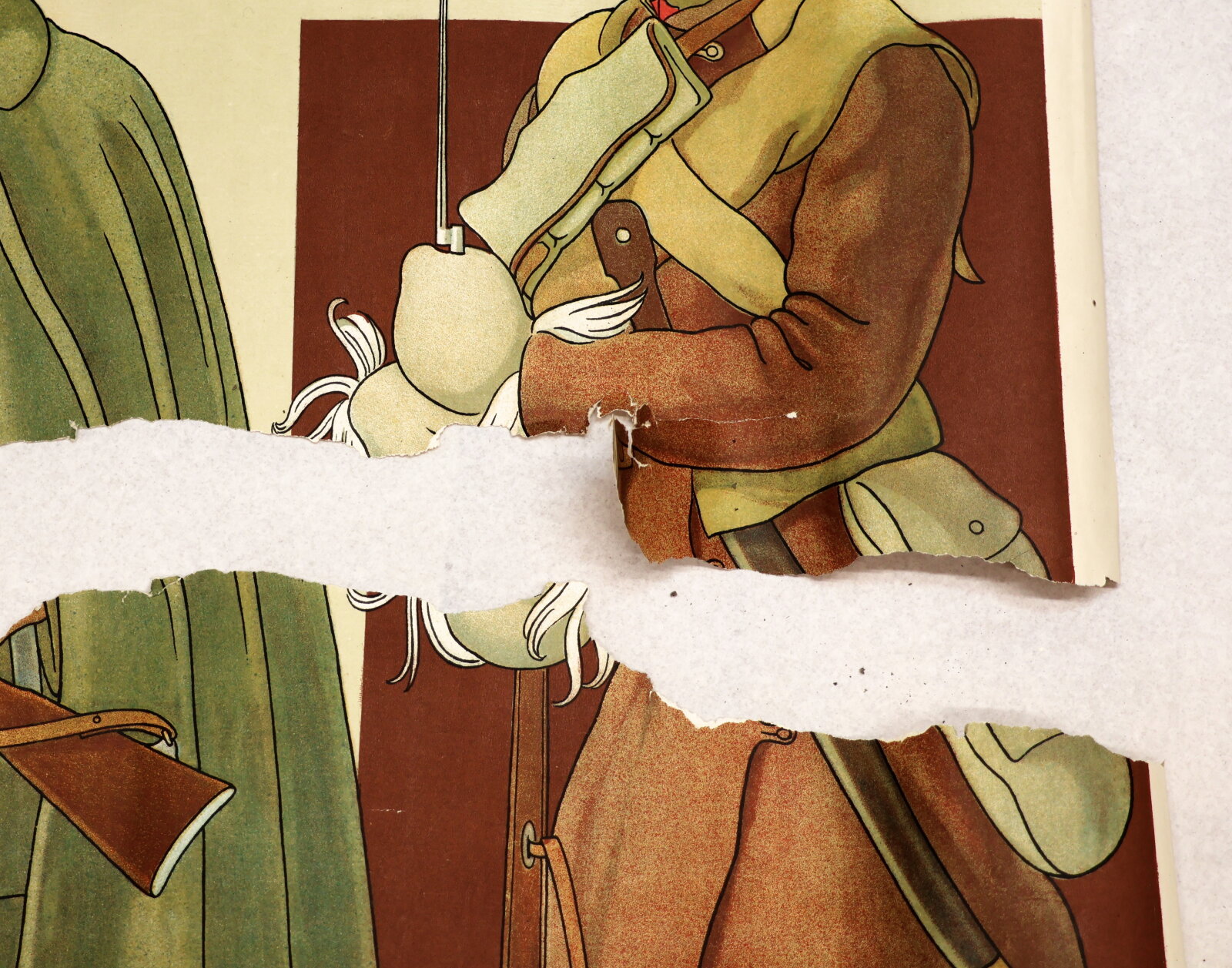 Plakáty se bohužel nedochovaly v nejlepším stavu, ale naší konzervátorce se podařilo je opět spojit a doplnit chybějící části tak, aby byla zachována pevnost celku k uložení do depozitáře.