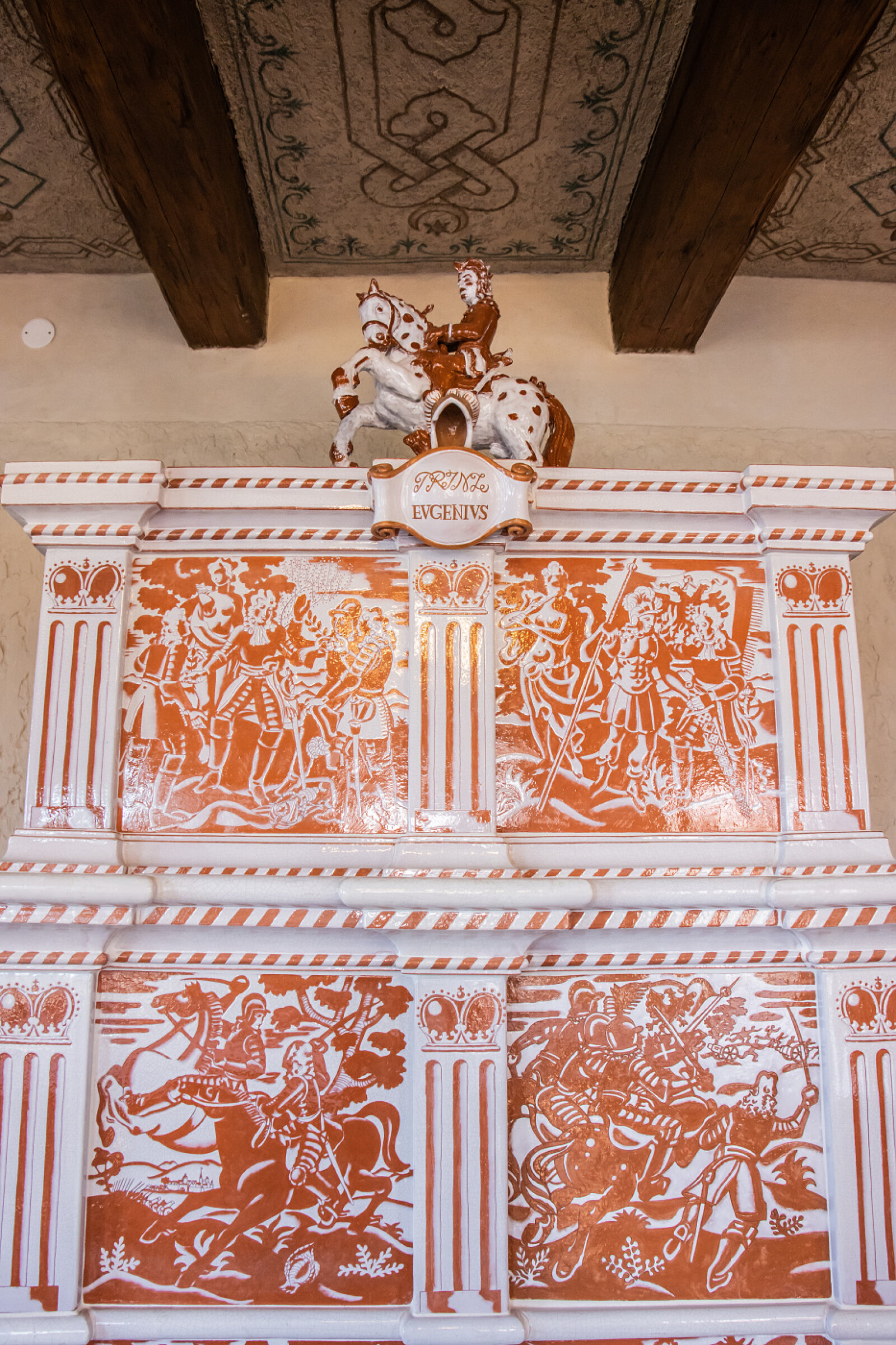 Obr. 4: Detail současné podoby kachlových kamen s jezdeckou sochou Evžena Savojského, 2022. Zdroj MuMB