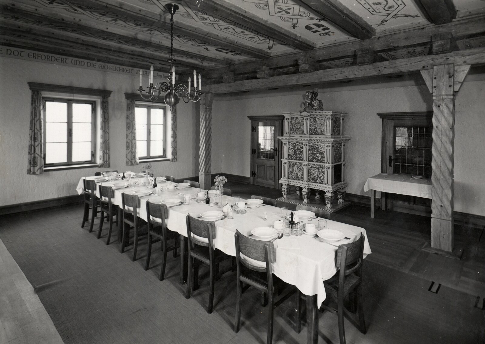 Obr. 3: Interiér Vlaštovčího hnízda. Uprostřed kachlová kamna s výjevy ze života Evžena Savojského. 1941. Zdroj MuMB