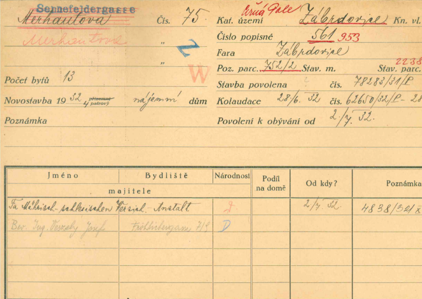 Obr. č. 7: Karta nemovitosti k nájemnímu domu na Merhautově 75. Zdroj Magistrát města Brna
