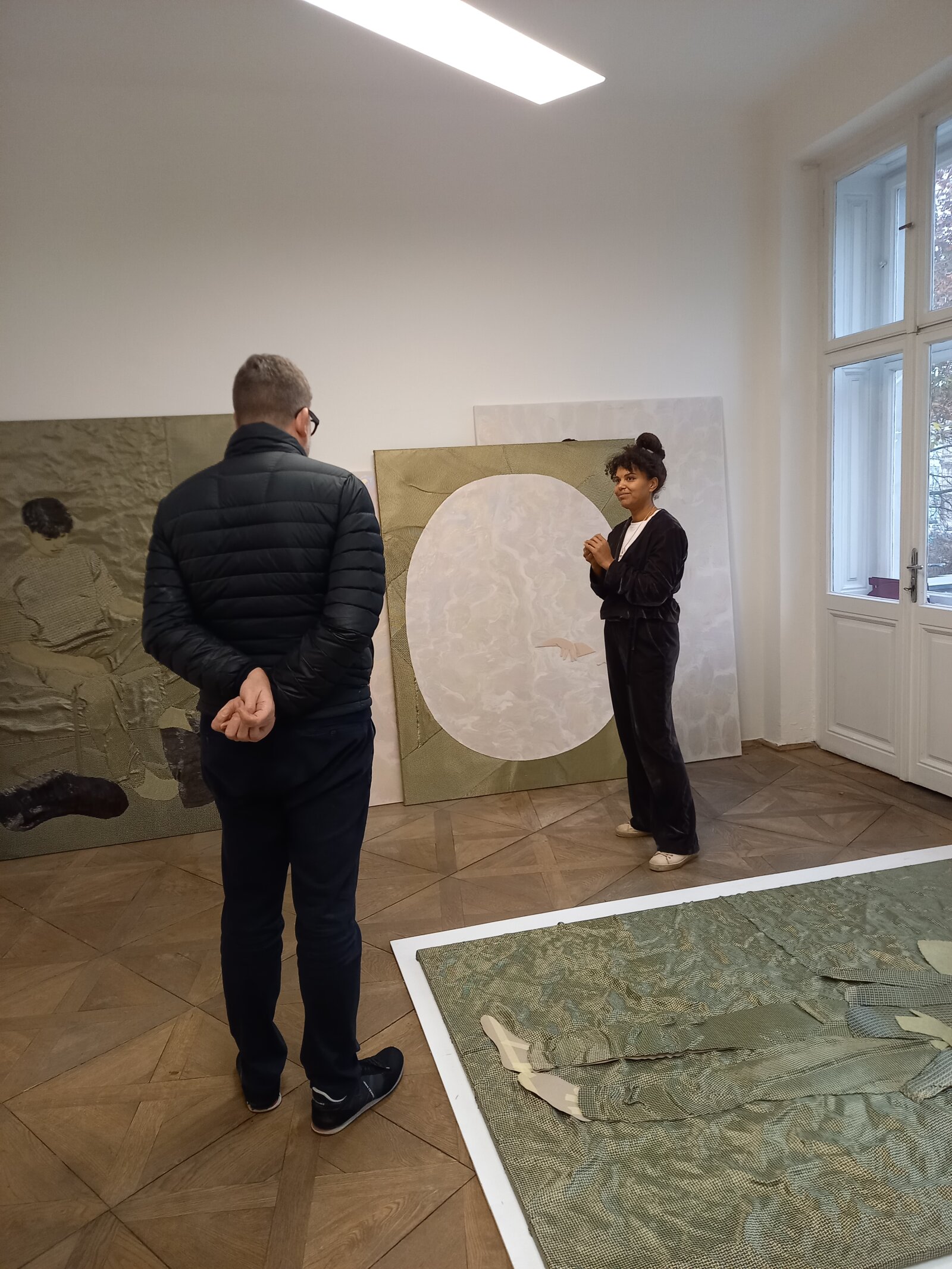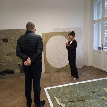 K činnosti Galerie města Brna patří pravidelné návštěvy uměleckých ateliérů. Aktuálně jsme se vypravili k Natalii Perkof, která má své studio přímo v srdci Brna. Zajímalo nás, jak se její tvorba aktuálně vyvíjí a jaké projekty Perkof připravuje. Tato zajímavá umělkyně totiž absolvovala Fakultu výtvarných umění VUT v Brně u Petra Veselého a Petra Kvíčaly. Dalo by se tedy očekávat, že zůstane ukotvena v klasické malbě a jejích možnostech. Perkof však překračuje hranice malířství směrem k objektu, instalacím a videu. V případech, kdy zůstane u závěsného obrazu, překvapuje svým vztahem k materiálnosti a prostorovosti, skrze které dospívá až k zpochybnění tradičních specifik obrazu, čehož dociluje vrstvením plátna, vyšíváním malby či naopak prořezáváním plochy a aktuálně i překrýváním podmalby karbonovou tkaninou. K posledním technologickým posunům patří využívání perleťových barev a asamblážování materiálu dýhy do obrazové plochy, což můžeme sledovat právě na fotografiích z ateliéru.