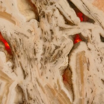 Dále je v publikaci Jana Sapáka kámen podroben petrografickému rozboru. Medově žlutá hornina s bílou kresbou, vytěžená v pohoří Atlas v tehdejším francouzském Maroku v severní Africe, je ve skutečnosti aragonitový sediment (uhličitan vápenatý). Jedná se o tzv. nepravý onyx, karbonátovou horninu (CaCO3), tedy druh vápence – aragonit. V případě skutečného onyxu by se muselo jednat o oxid křemíku (SiO2), což je polodrahokam – chalcedon. Kvůli specifickým podmínkám při svém vzniku se také objevuje pouze v menších peckách, nikdy jako lomový kámen, jak je tomu v případě vily Tugendhat. I přes vědeckou nesprávnost je toto pojmenování natolik rozšířené, že se jedná o naprosto zavedený obchodní název, který prakticky nemá alternativu.