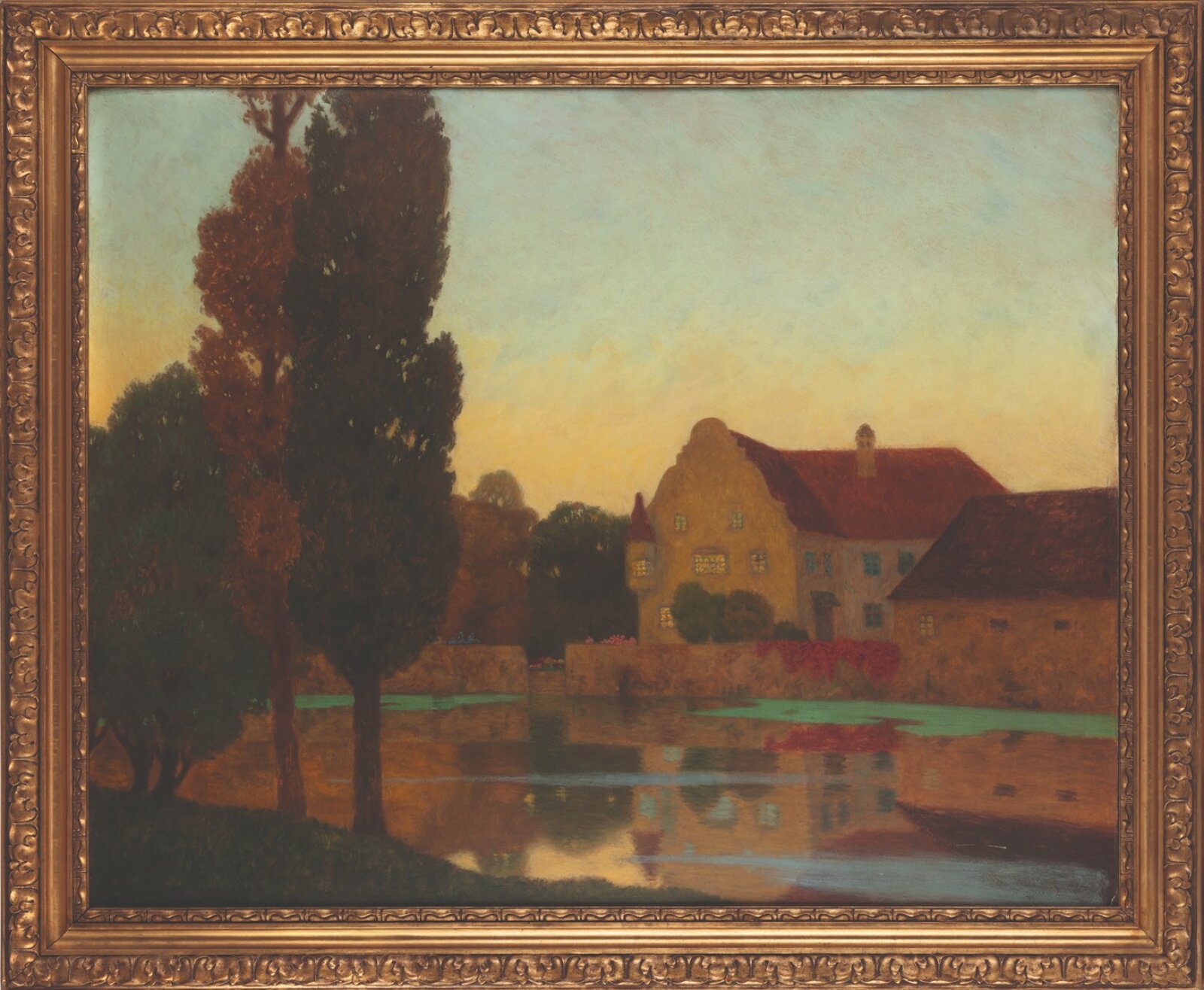 Mezi tyto umělce patřil i Eduard Kasparides. Narodil se v Křenově u Moravské Třebové. Podobně jako další nejvýznamnější moravští malíři 19. století se po studiích na vídeňské akademii usadil ve Vídni a nadále udržoval intenzivní kontakty s Moravou. Pravidelně vystavoval na výstavách spolku Mährischer Kunstverein, který v Brně pořádal hlavní umělecké výstavy. Působil v předsednictvu uměleckého sdružení Mährischer Künstlerbund. Jeho tvorba prošla třemi fázemi. Po dvou figurativních etapách se přeorientoval na symbolistní krajinomalbu, kterou se proslavil. Na středoevropské poměry pracoval s nezvyklou barevností, v níž ho inspirovala britská a skandinávská malba. Za své krajinomalby získal čestné uznání na Světové výstavě v Paříži v roce 1900 a prestižní malou zlatou medaili, medaili arcivévody Carla Ludwiga a Drascheho cenu na výstavách ve vídeňském Künstlerhausu. Obraz Zámek u jezera patří právě do tohoto Kasparidesova tvůrčího období.