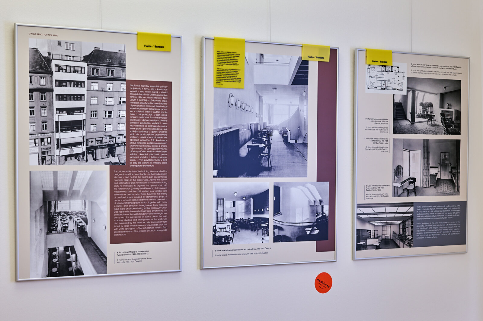 „Nový svět“ Kamila Fuchse symbolicky navazuje na předcházející výstavní intervenci Nový svět Bohuslava Fuchse a Rudolfa Sandala. Další výstavní „vrstva“, vstupující do stálé expozice O nové Brno. Brněnská architektura 1919–1939, představuje čtyři kapitoly z díla Kamila Fuchse. Spolupráce otce a syna Fuchsových se zaměřuje na společné soutěže a projekty. Architektonický vstup Kamila Fuchse do staveb Bohuslava Fuchse prezentuje zajímavý moment, kdy syn reagoval na modernistická díla otce, pro něž vytvořil nové interiéry. Třetí kapitolou je Péče o odkaz otce, jemuž Kamil Fuchs navrhl náhrobek a pamětní desku. Poslední na hradě Špilberku prezentovanou a veřejnosti zcela neznámou kapitolou z díla Kamila Fuchse je jeho vlastní volná Výtvarná tvorba, exkluzivně zapůjčená pro tuto příležitost.