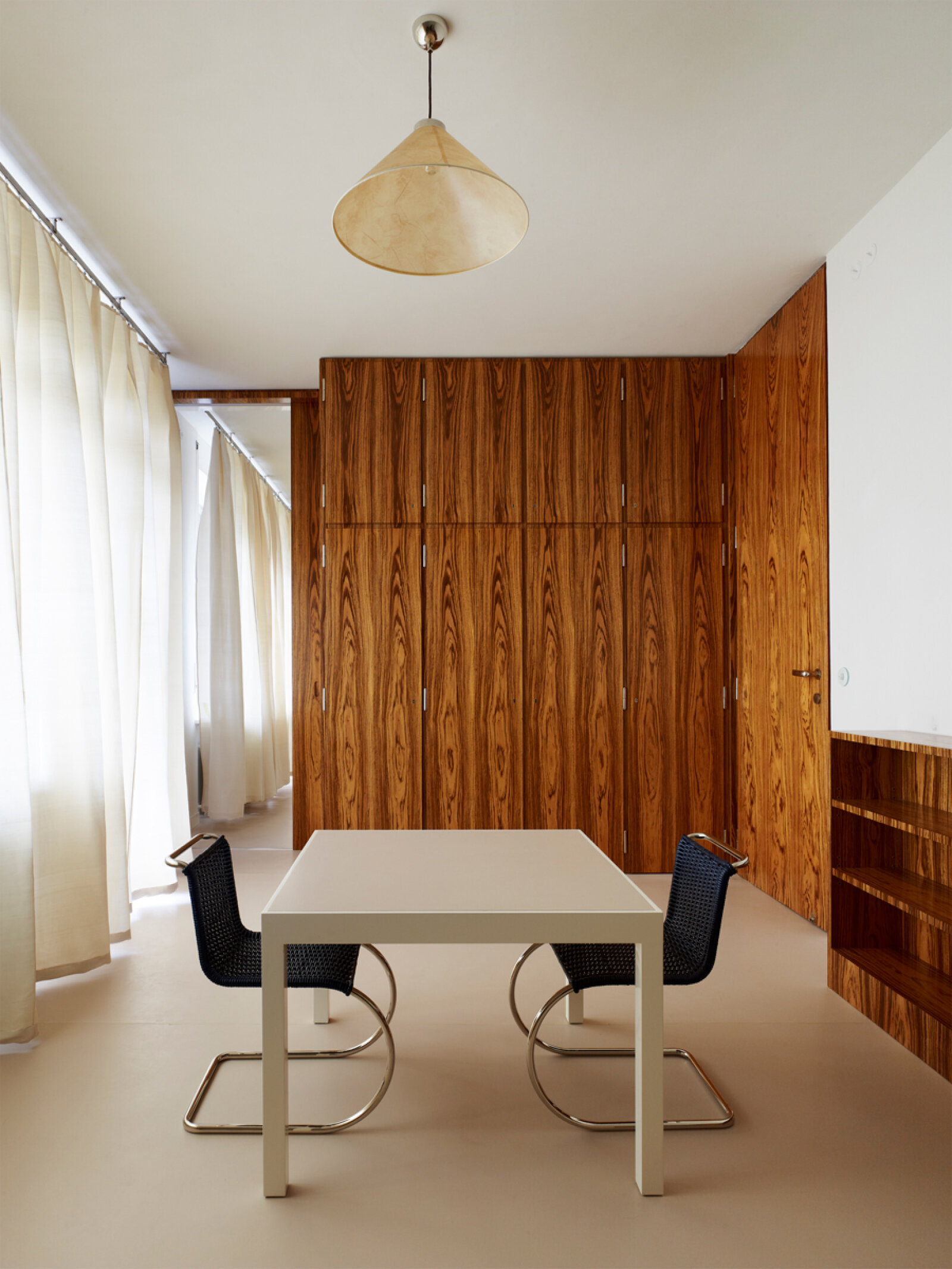 Vestavěné skříně v pokojích Grety a Fritze Tugendhatových a dřevěné obložení ve vstupní hale včetně dveří byly dýhovány palisandrem pocházejícím z jihovýchodní Asie. Pro nábytek a dveře v pokojích nejstarší dcery Hanny a vychovatelky byly zvoleny dýhy afrického zebrana s výraznější kresbou. Všechny vestavěné skříně musely sahat od podlahy až ke stropu a vytvářet tak jednolitou plochu, díky které může přirozená kresba dýhy dobře vyniknout.