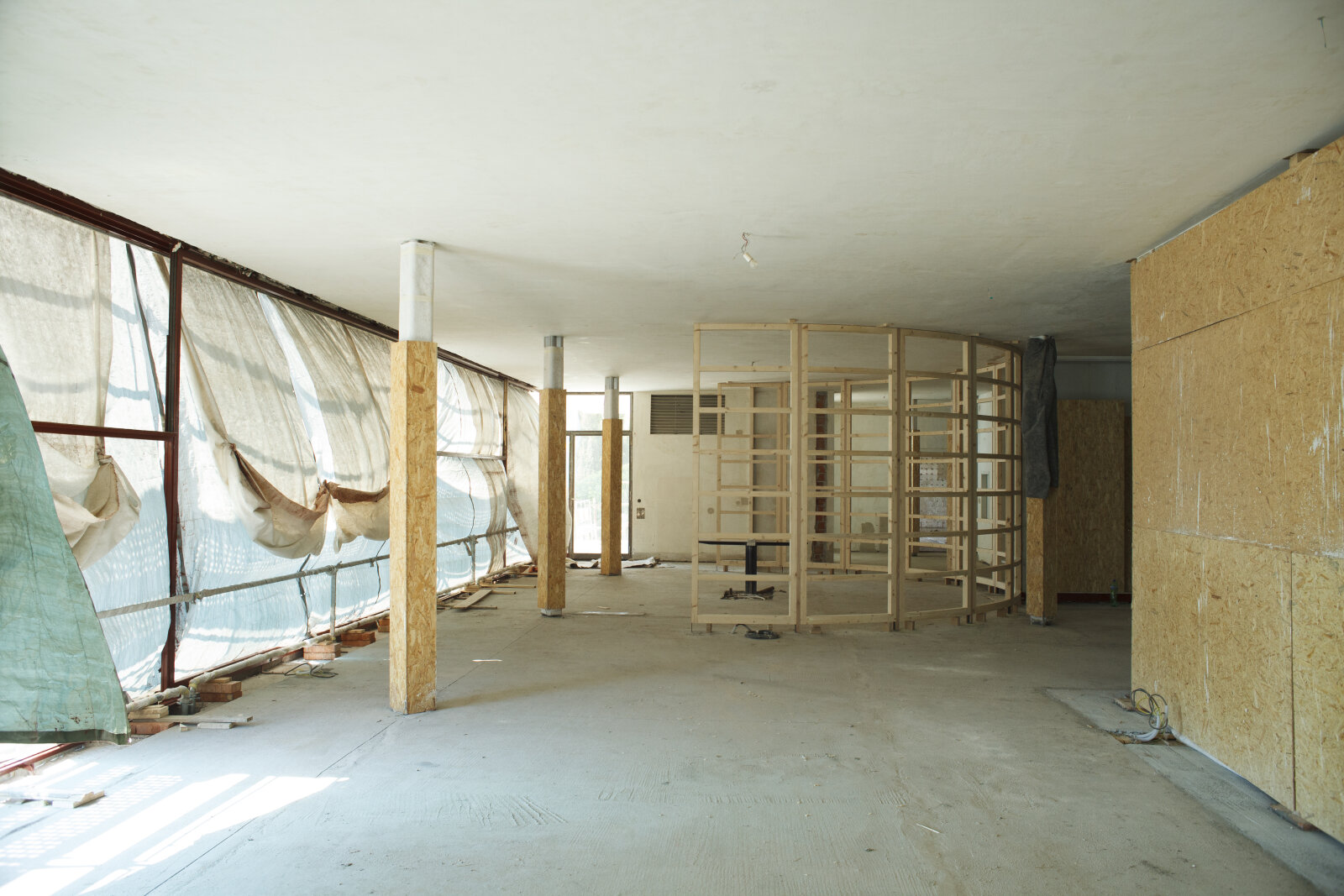 - Dřevěný nosný rošt pro osazení panelů příčky z makassarského ebenu v průběhu památkové obnovy, Foto: David Židlický (2011)