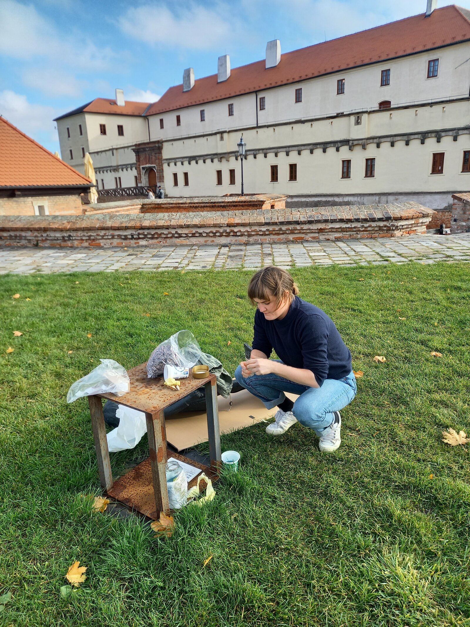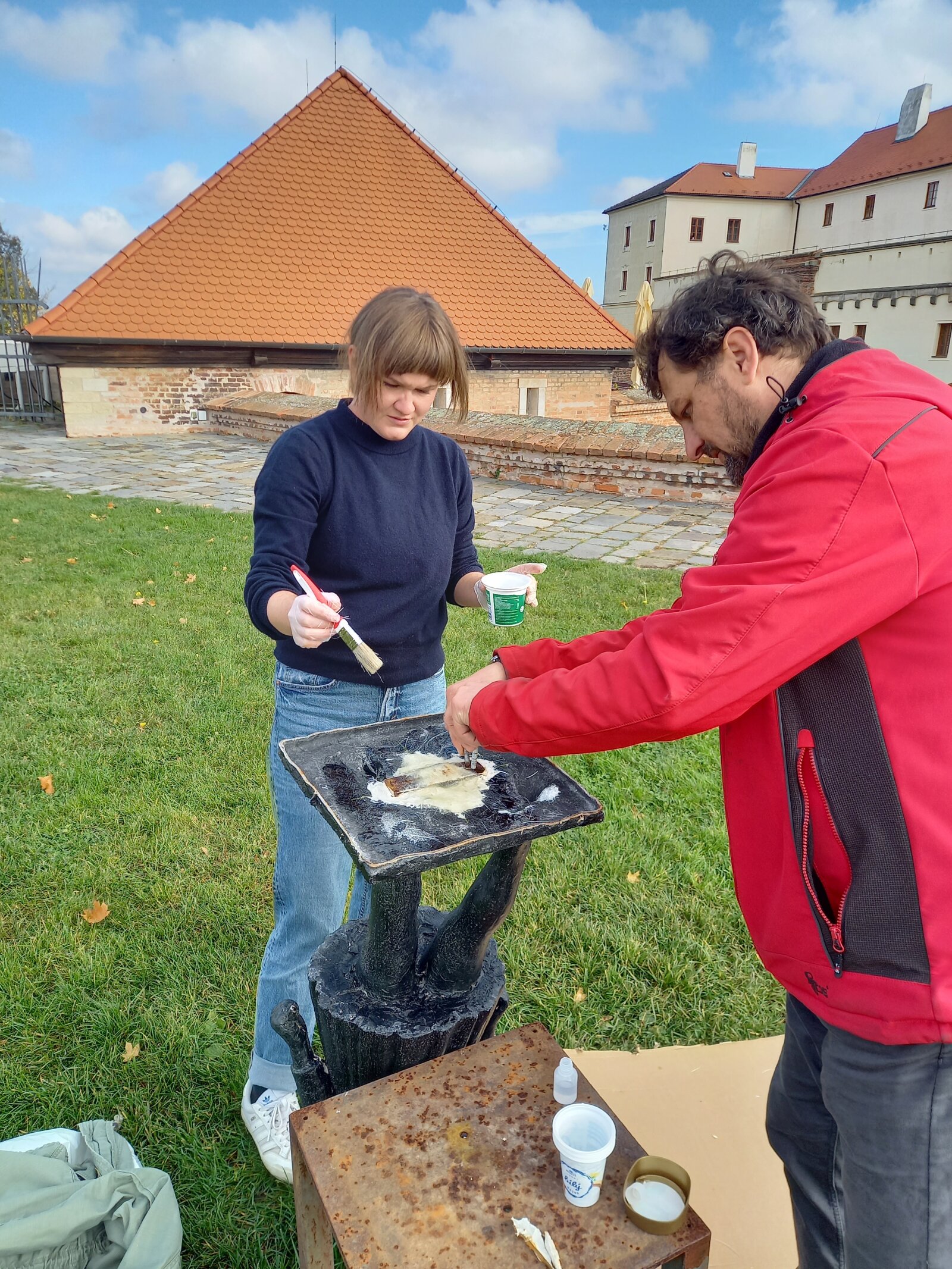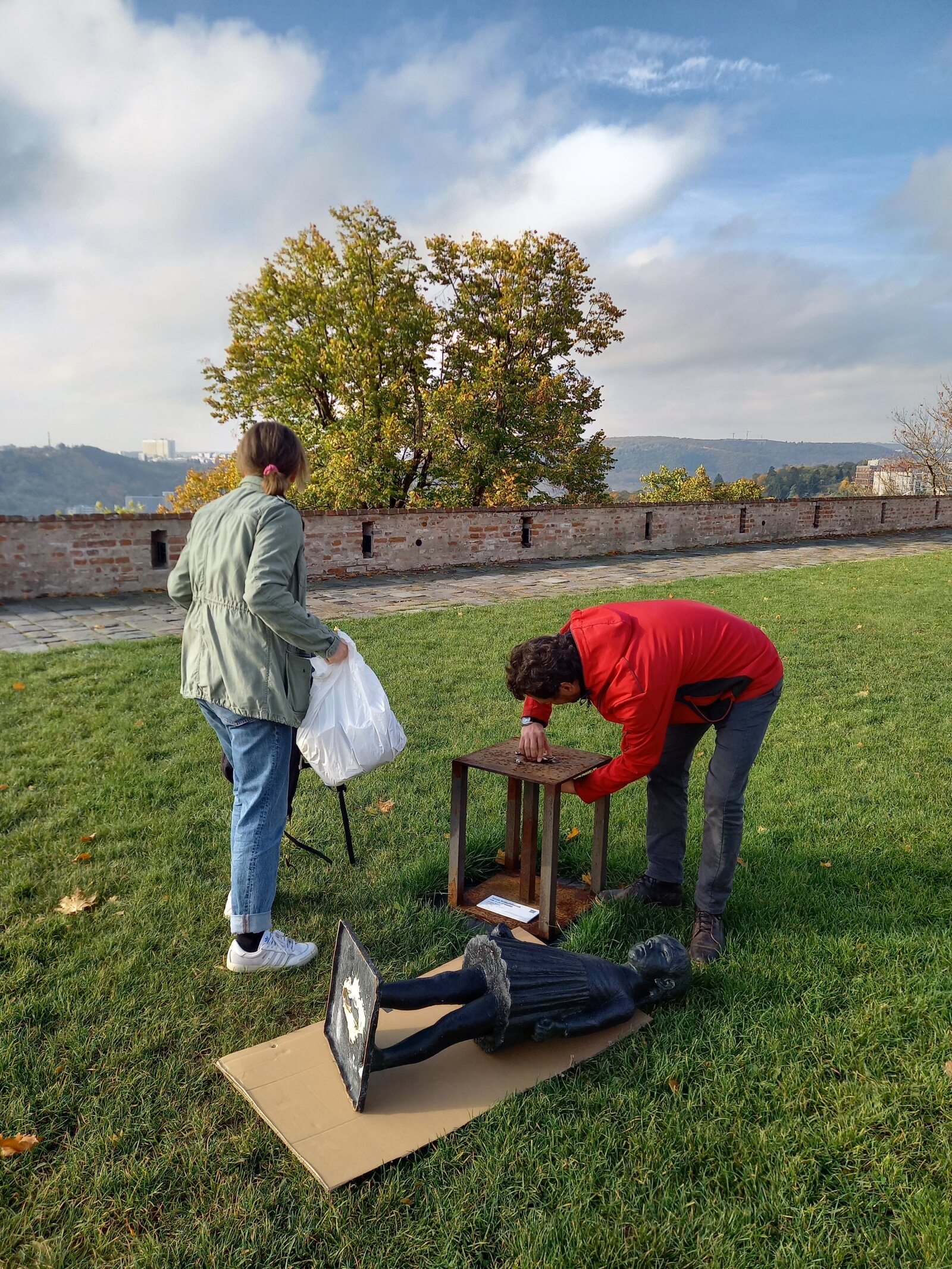 Galerie města Brna již třetím rokem pořádá v exteriérech hradu Špilberk sochařské výstavy, a sice pod názvem Sochy na hradě. Letošní třetí ročník jsme věnovali sochařovi Nikosovi Armutidisovi a jeho dceři – sochařce Ireně Armutidisové. Jsme rádi, že návštěvníci výstavu uvítali s nadšením, jak dosvědčila i hojná účast na letní vernisáži. Vždyť sochy oživují prostor a svou přítomností utvářejí na prostranstvích i v zákoutích hradu novou atmosféru. Bohužel čas od času se stane, že si návštěvníci sochařská díla zamění s prolézačkami. Některé sochy tuto zátěž vydrží, jiné utrpí značné poškození. To se bohužel tento podzim přihodilo již podruhé. V prvním případě jsme sochu byli nuceni deinstalovat a podrobit nákladným restaurátorským zásahům. V druhém – právě aktuálním případě – se podařilo společně s autorkou – Irenou Armutidisovou – sochu děvčátka opravit na místě a znovu osadit. Plastika Irenka (2025), inspirovaná autorčinou dcerou, díky tomu může opět oživovat prostranství na jihozápadním bastionu. Užijte si tedy barevný podzim na hradě v její společnosti a nezapomínejte, že každé umělecké dílo ve veřejném prostoru slouží k naší radosti a je určeno jen pro naše oči.