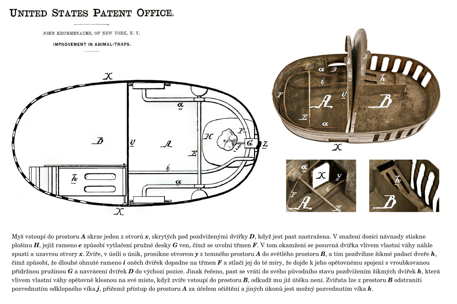 Sám autor popisuje past v textu patentu takto: „Tento vynález je určen k postupnému chytání většího počtu zvířat do jediné pasti; tohoto cíle dosahuji tím, že past je zkonstruována způsobem, který je dále podrobně popsán, a to tak, že každé zvíře, které je chyceno, při přechodu z tmavého do světlého prostoru ve snaze uniknout, past znovu nastaví.“