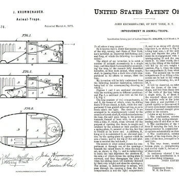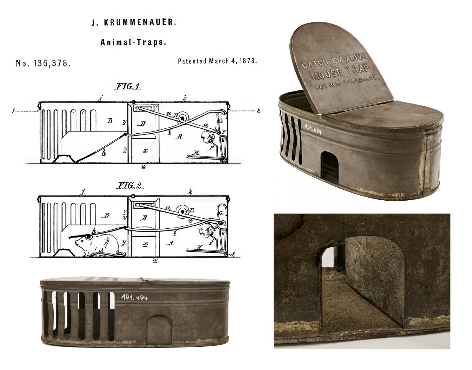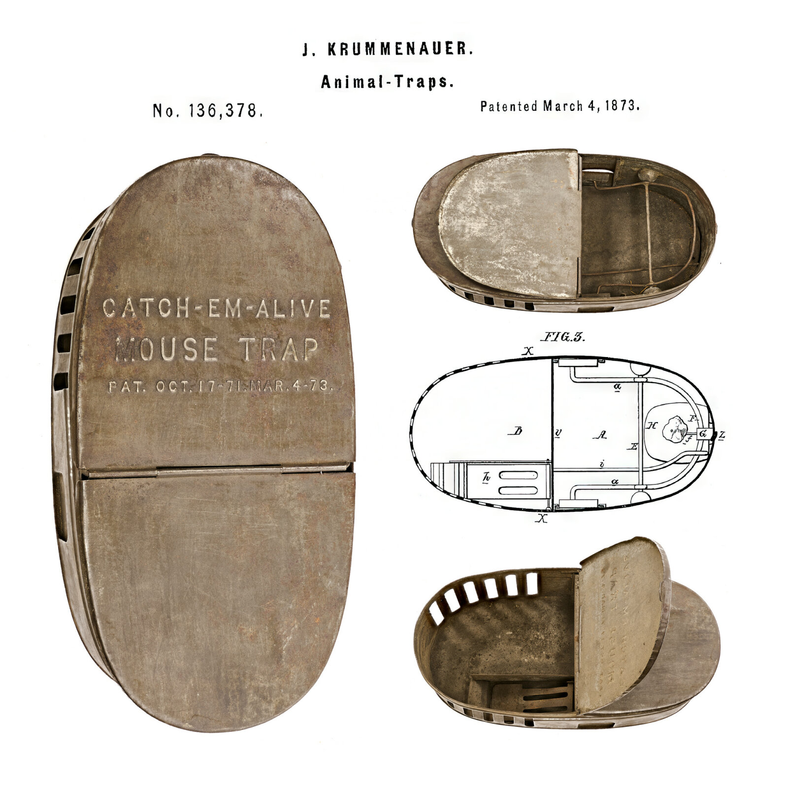 „Catch-em alive“ (Chyťte je živé) hlásá nápis na víku pasti americké výroby. Byla patentována 4. března roku 1873 Johnem Krummenauerem z „města a státu New York“, jak se můžeme dočíst v textu patentu. Krummenauer tímto počinem zdokonalil dřívější obdobný patent George Hardinga z roku 1871 a později si nechal patentovat ještě několik petrolejových lamp.