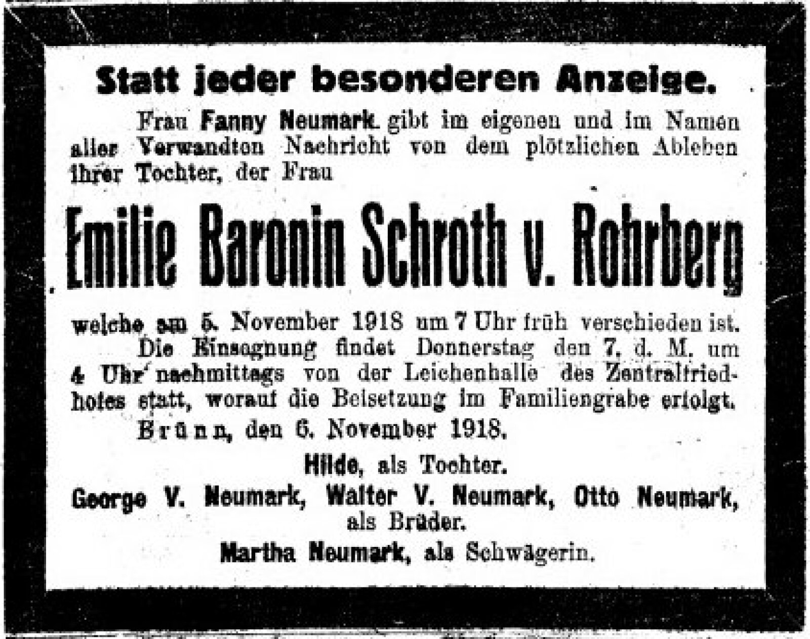 Obr. č.33: Úmrtní oznámení Emilie Schroth von Rohrberg, rozené Neumarkové, 1918. Zdroj Geni.com