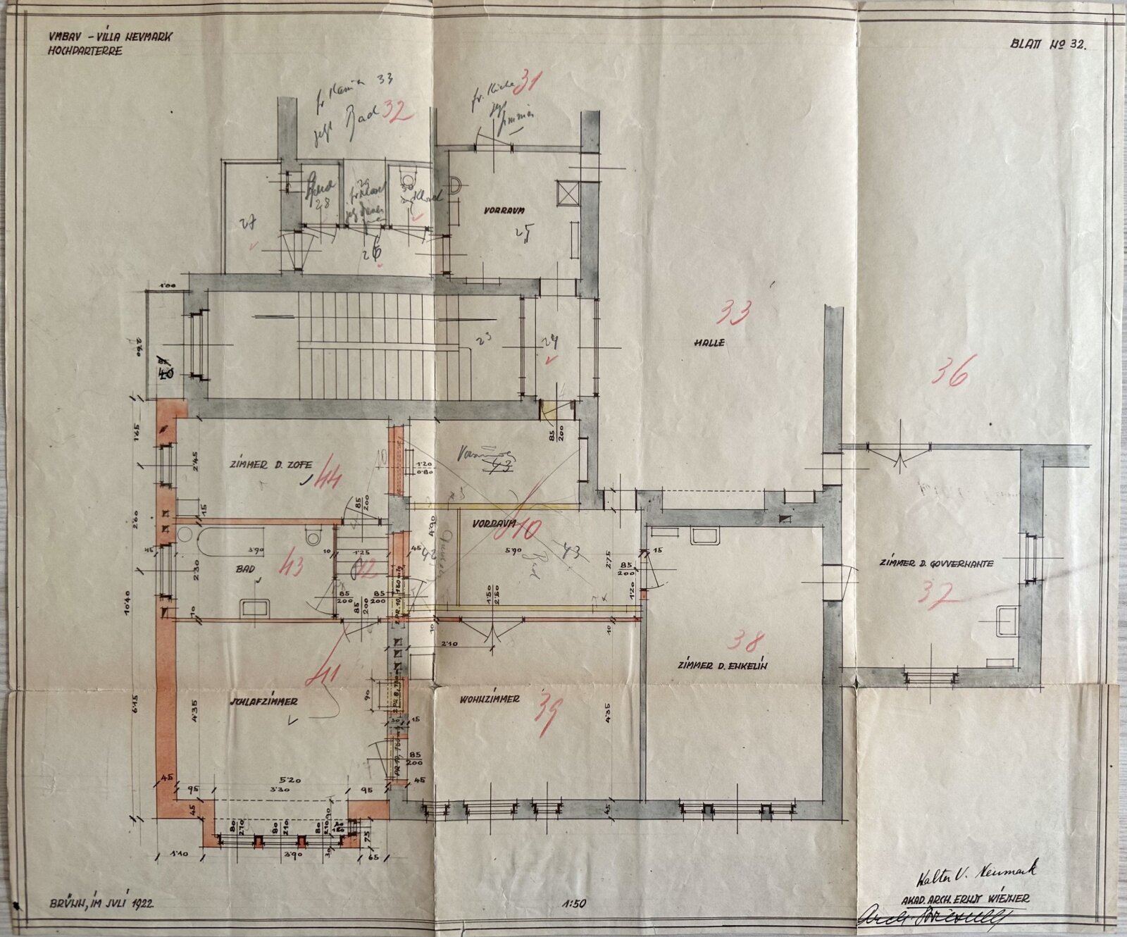 Obr. č.2: Plán přístavby vily na Hlinkách 144 z roku 1922 od Ernsta Wiesnera. Zdroj Archiv města Brna, fond U9