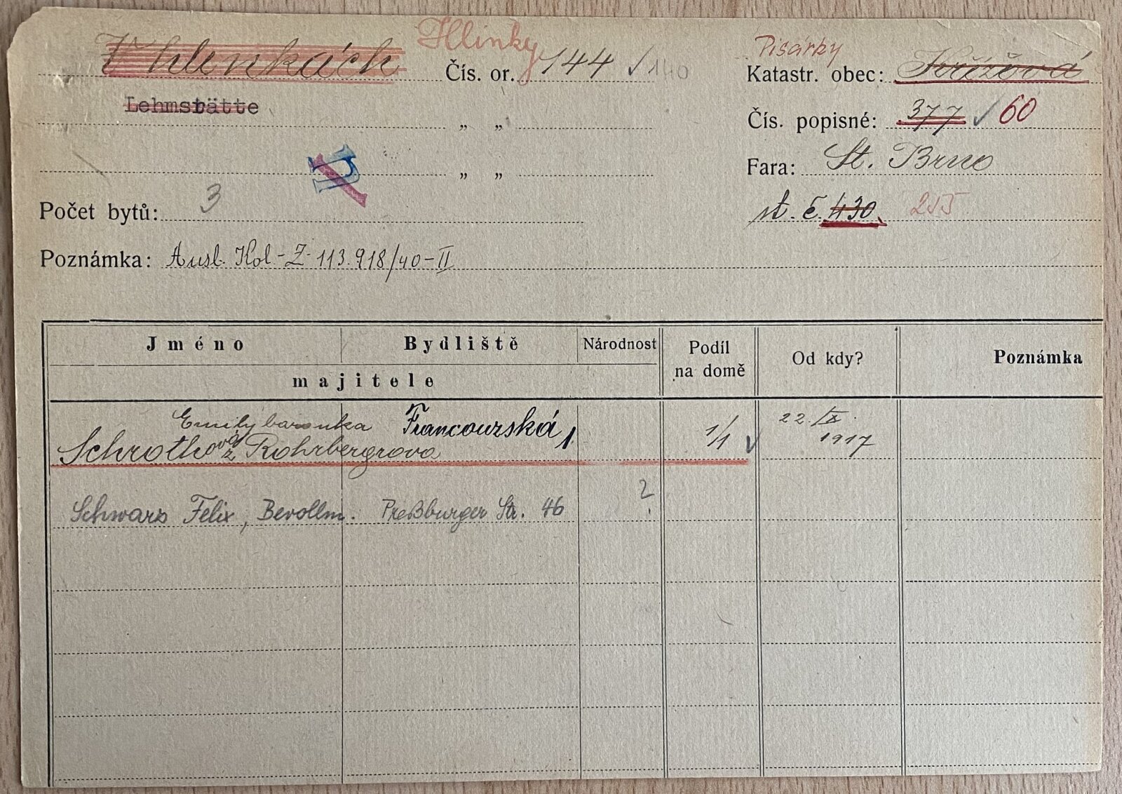 Obr. č.34: Karta nemovitosti k vile rodiny Neumark na Hlinkách 144. Zdroj Magistrát města Brna