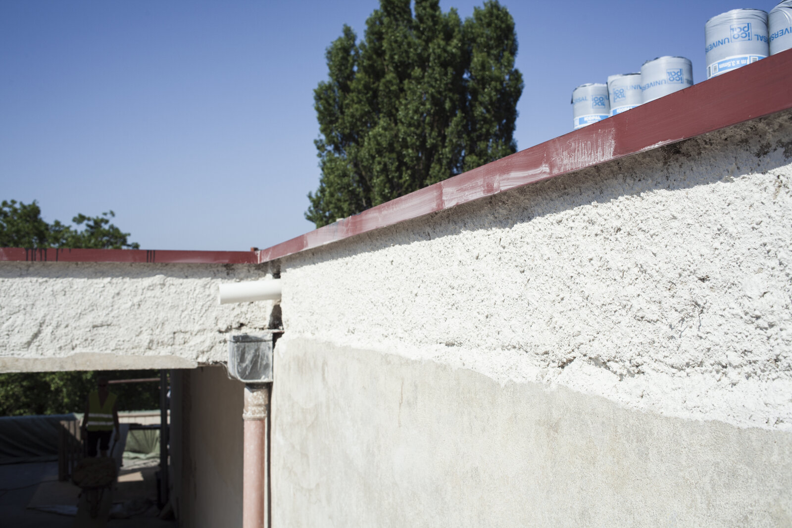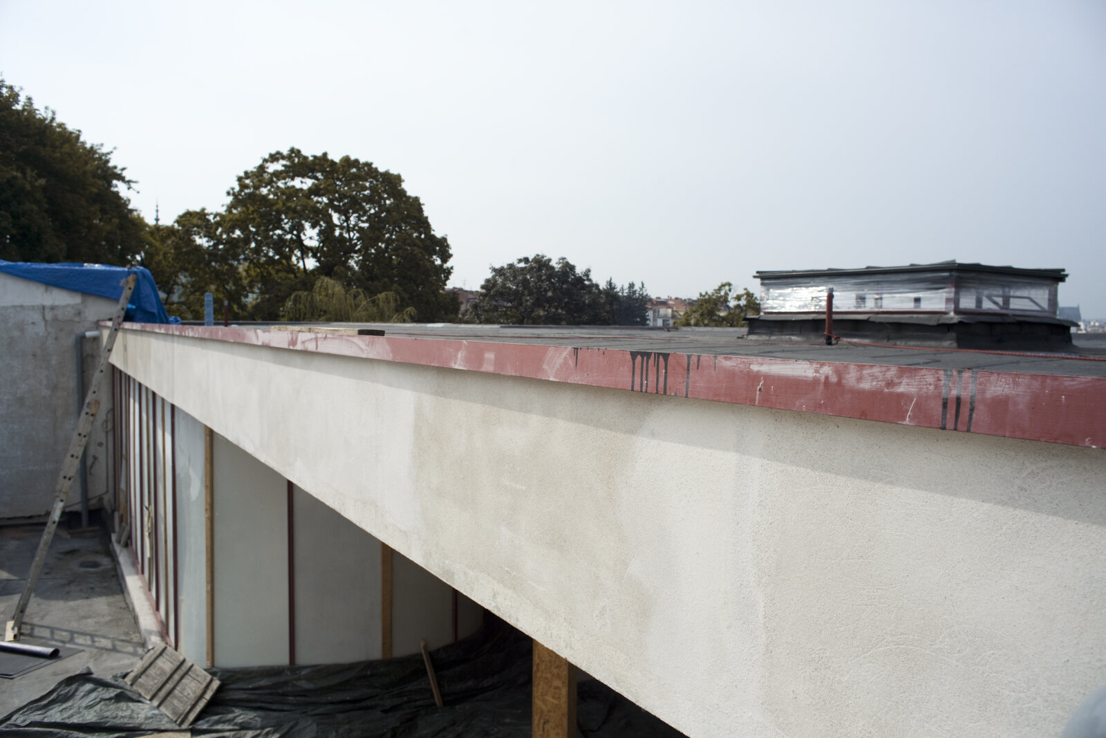 Snížená betonová atika střechy a restaurovaný střešní světlík koupelny rodičů v průběhu památkové obnovy, Foto: David Židlický (srpen 2011)