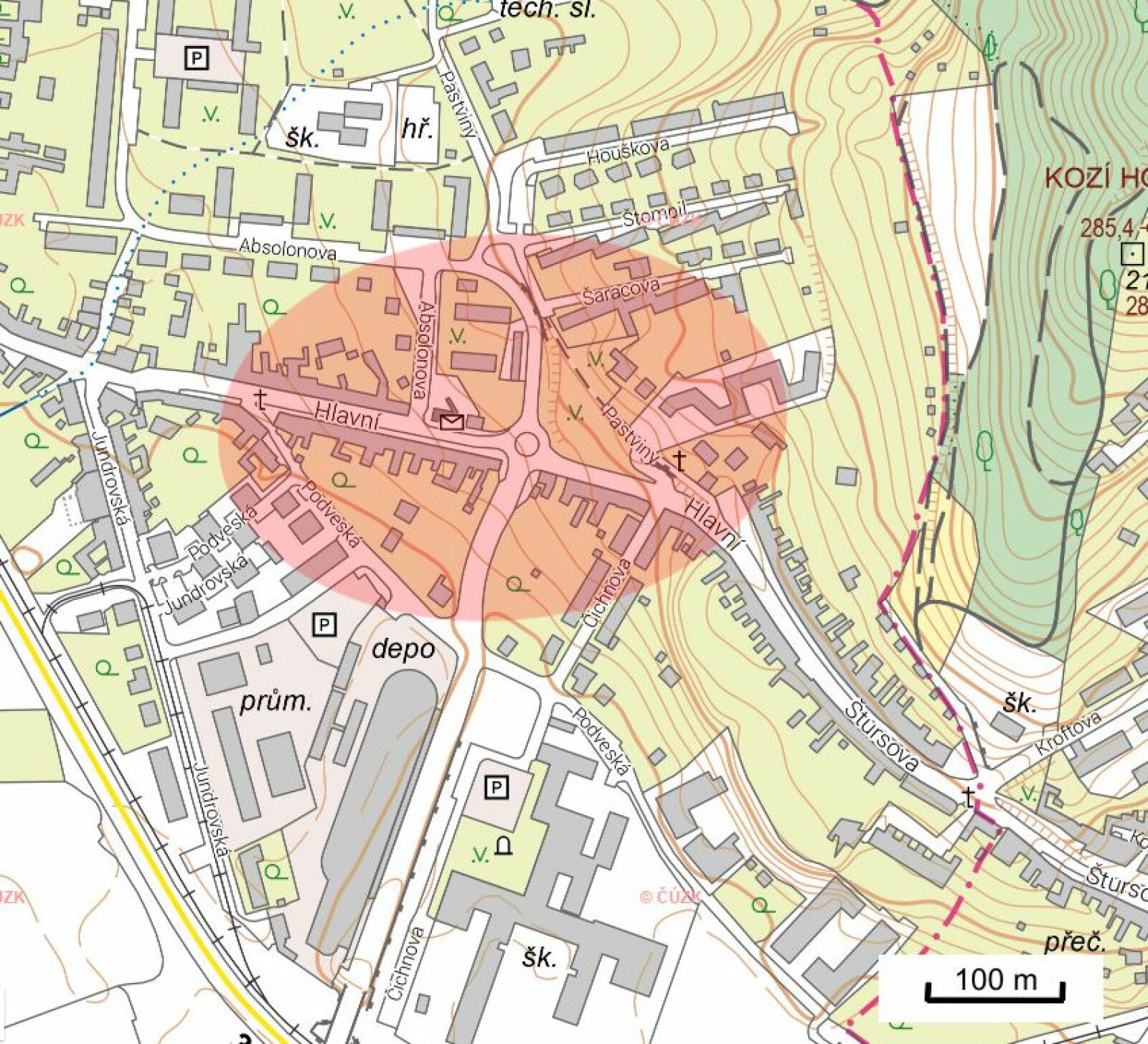 Obr. 4: Lokalita Komín – Nivy na současné mapě. Zdroj mapy: ČÚZK