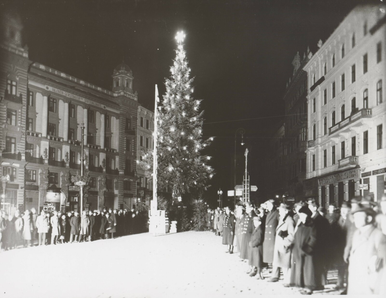 Zkušenosti s touto tradicí si přivezl z Kodaně, kde se podobné vánoční stromy již pořádaly. Jeho vize se stala skutečností 13. prosince 1924, kdy byla na náměstí Svobody vztyčena 15 metrů vysoká jedle, ozdobená elektrickými žárovkami. V 17:00 se strom poprvé rozsvítil a pod ním byly umístěny tři pokladny a schránka na dary pro potřebné.