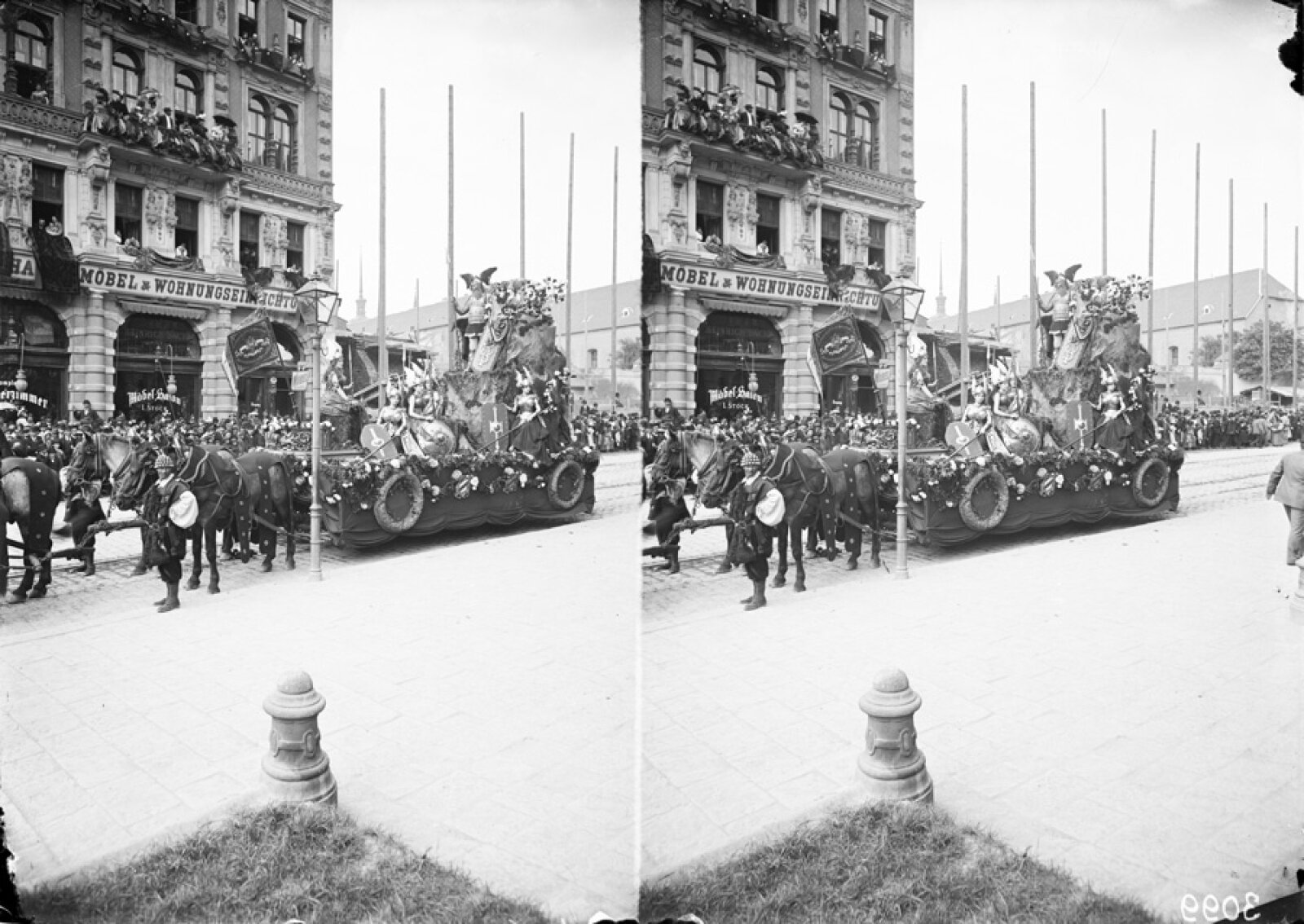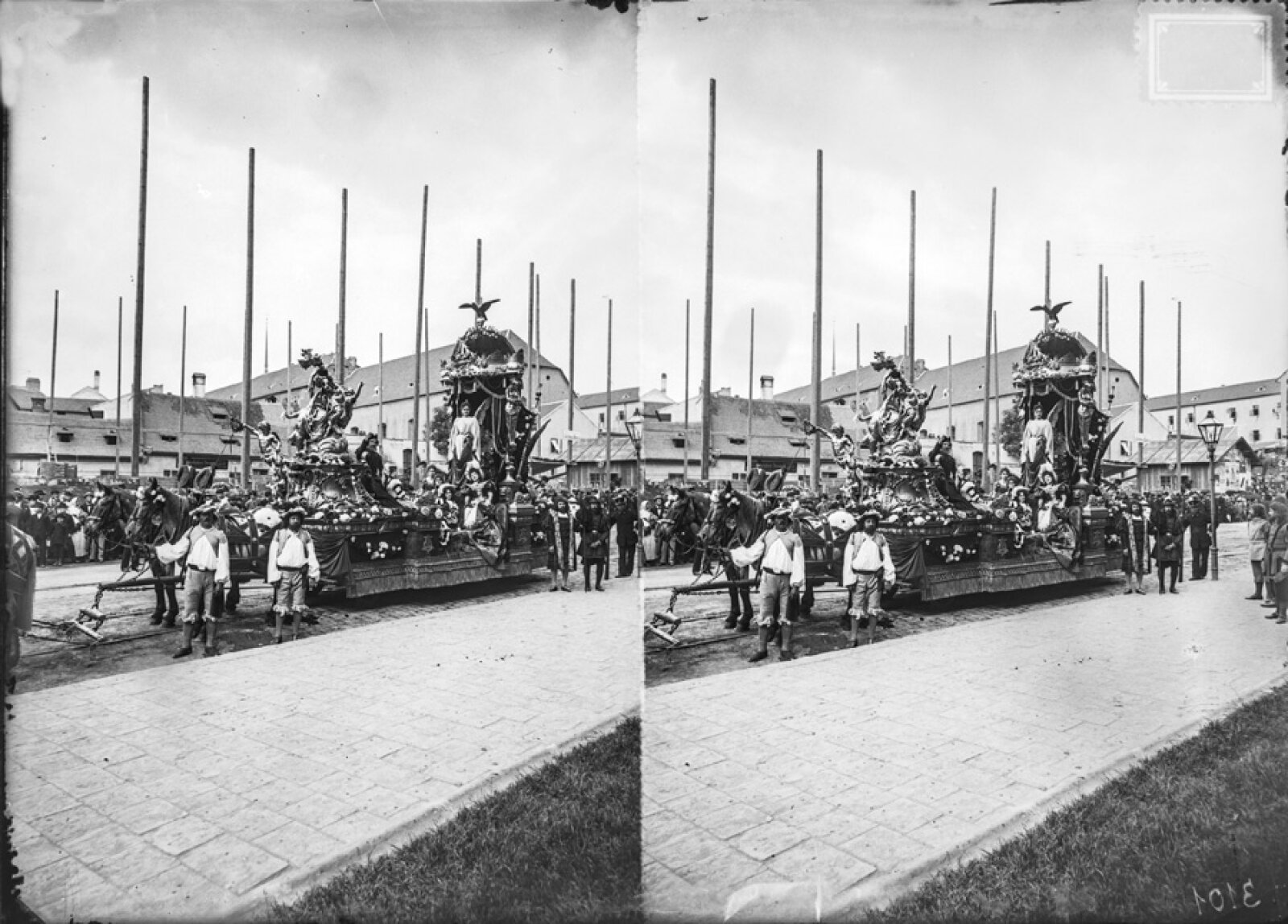 3 – 4. Alegorické vozy v průvodu vítajícím císaře Františka Josefa I. při jeho návštěvě v Brně, 26. června 1892, skleněný stereonegativ, MuMB