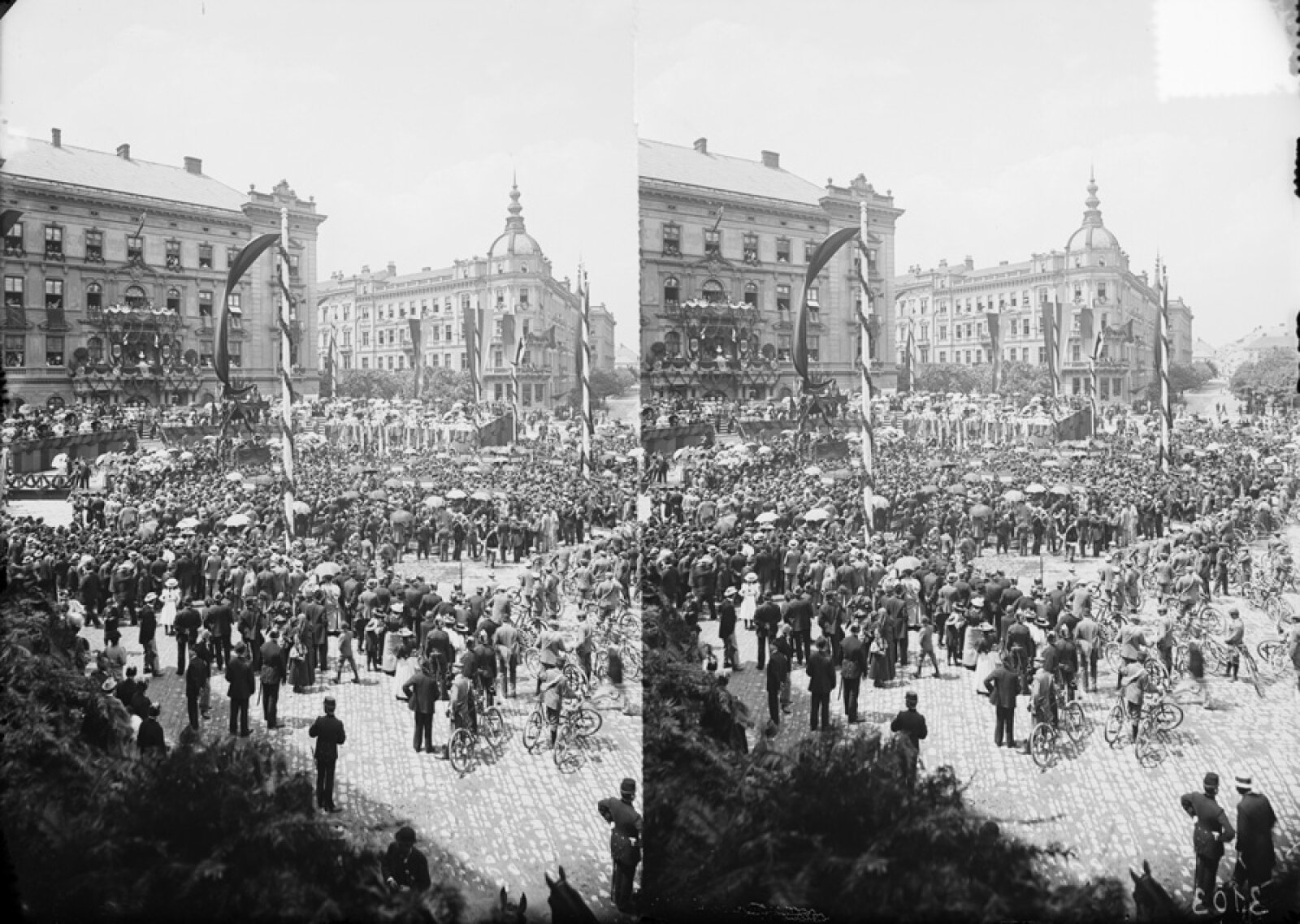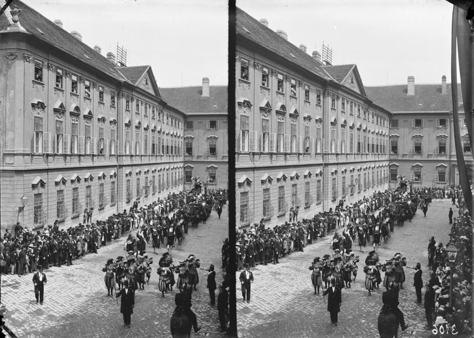 1. – 2. Slavnostní uvítání císaře Františka Josefa I. v Brně na dnešním Moravském náměstí, 26. června 1892, skleněný stereonegativ, MuMB