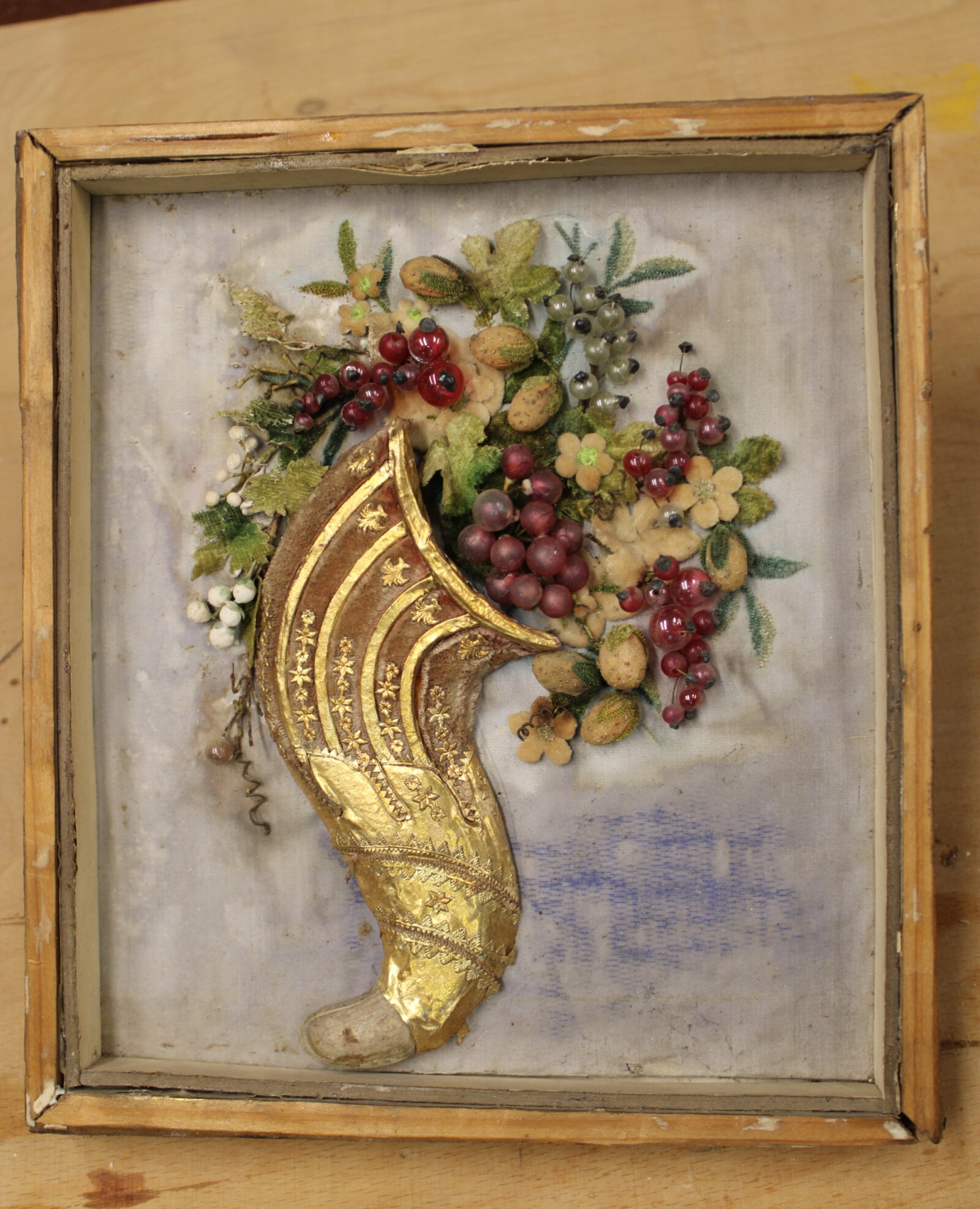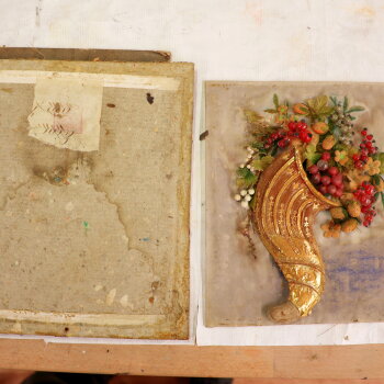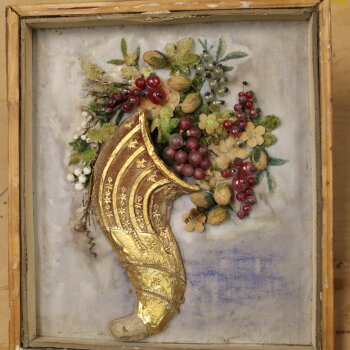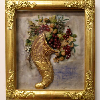 Mistrovská práce šikovných rukou konzervátorů a restaurátorů muzea zrodila do krásy nástěnný plastický obrázek “Rohu hojnosti”.