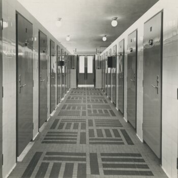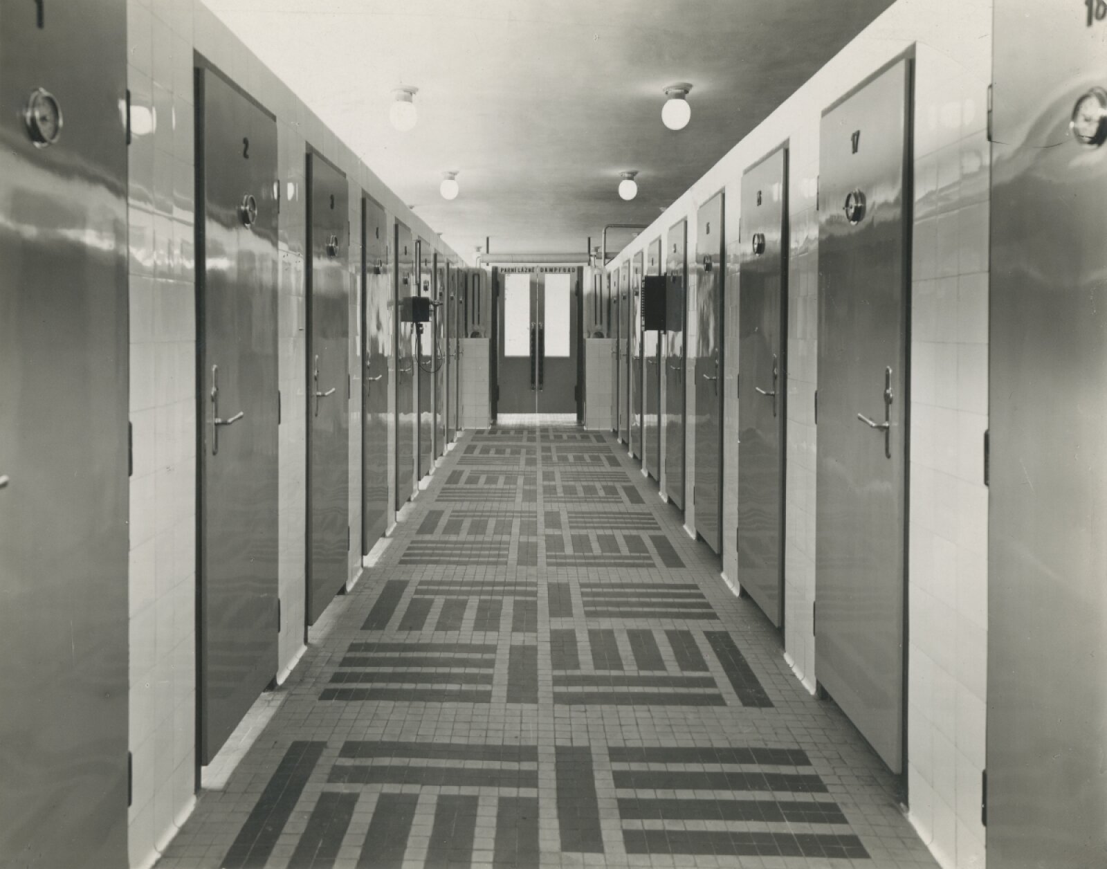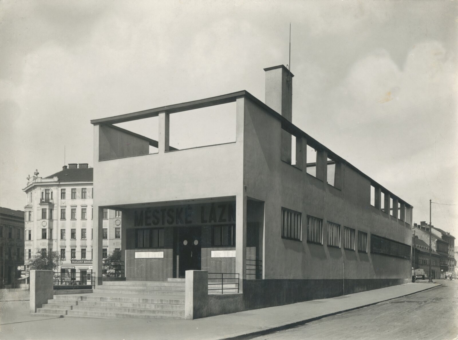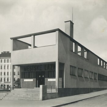 Bohuslav Fuchs, autorská koláž vytvořená z originálních Sandalových snímků Městských lázní Kopečná v Brně 1929