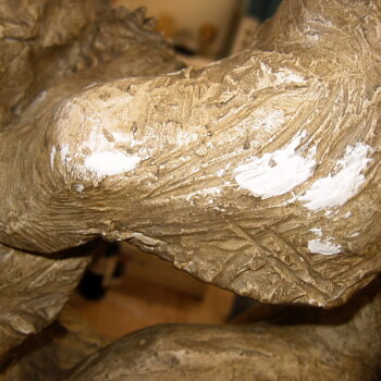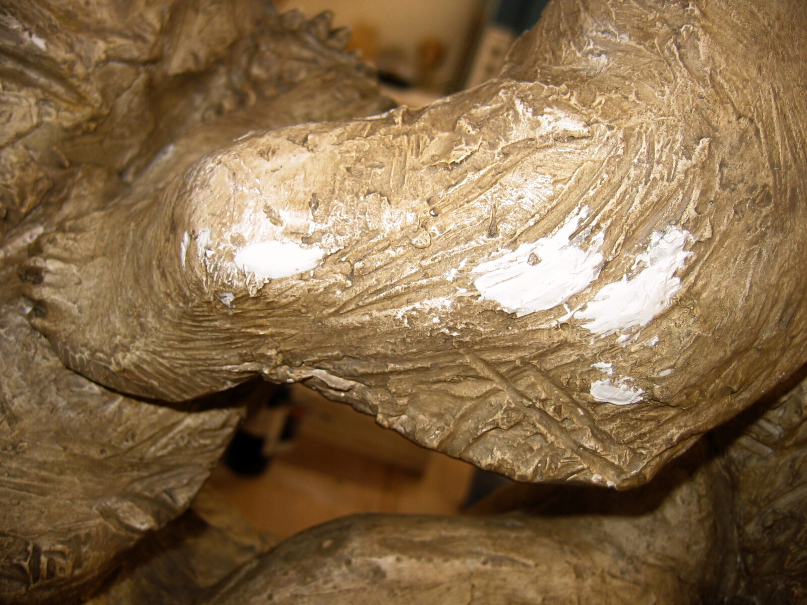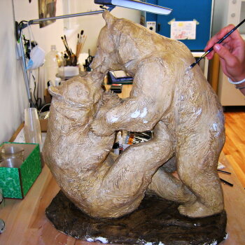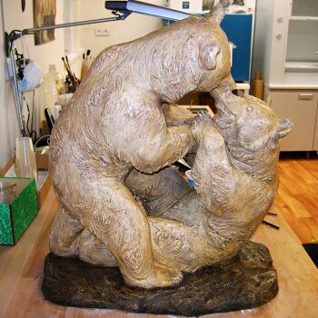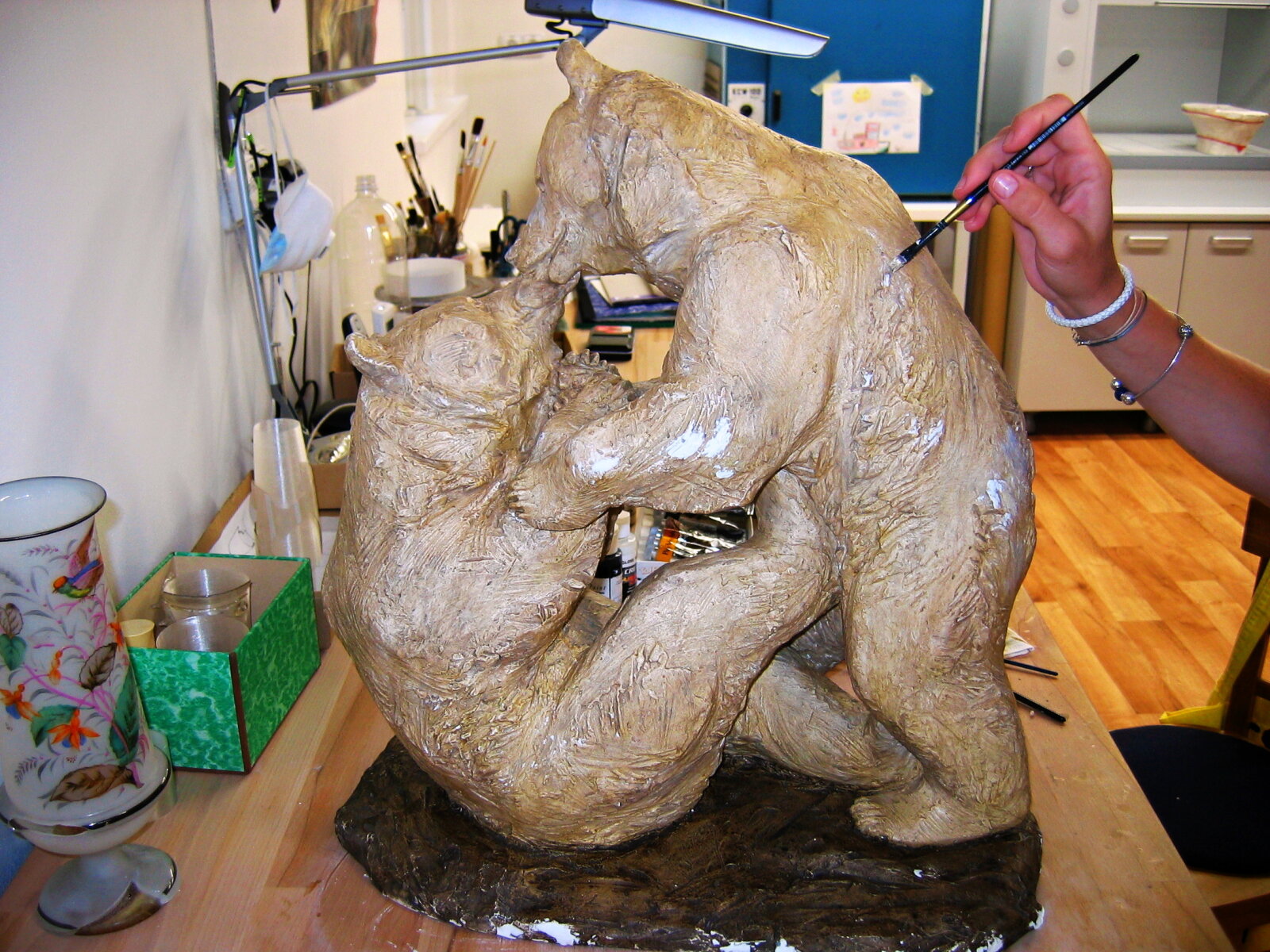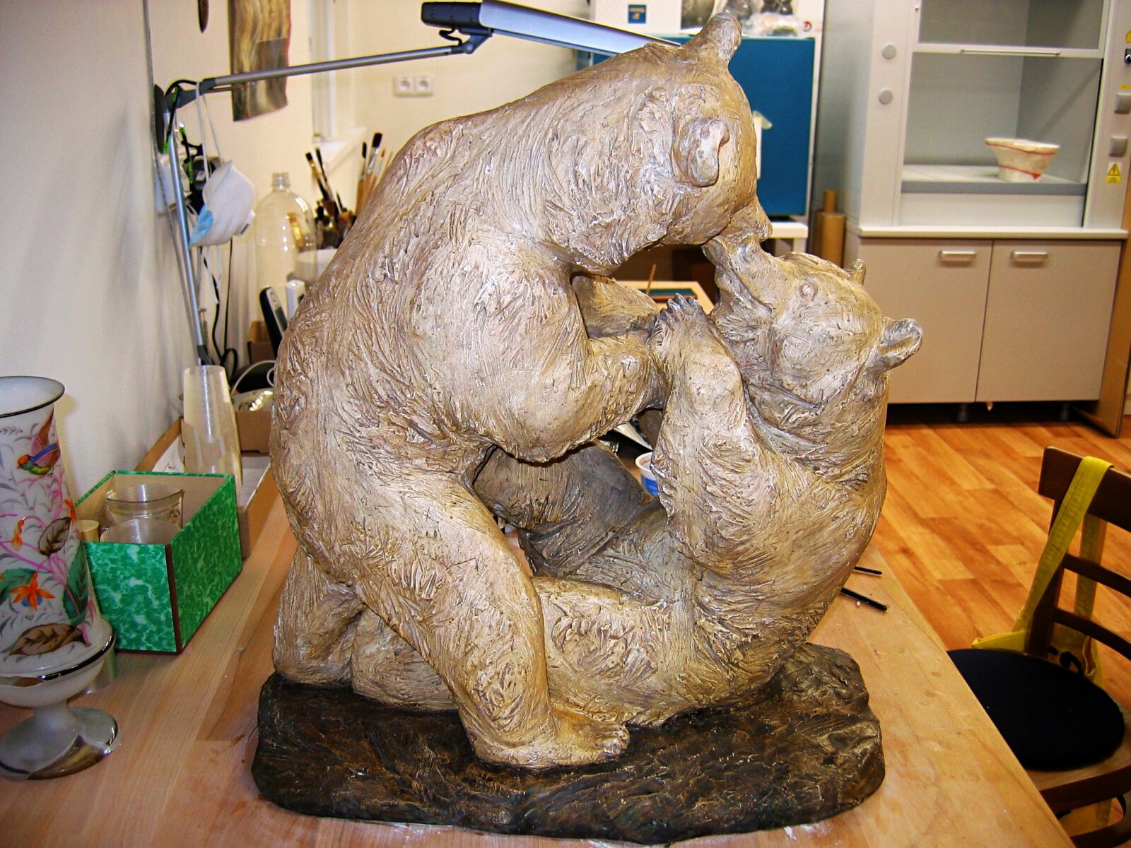 Sádrová plastika dovádějících medvíďat brněnské sochařky Sylvy Lacinové se objevila v našich dílnách. Leta skladování a přenášení zanechala na plastice spoustu drobných otluků. Ty se musely zatmelit a zaretušovat včetně barevné retuše na povrchu sjednocující celkovou vizáž plastiky. A konečný výsledek šikovných rukou naší konzervátorky můžete vidět na poslední fotografii.
