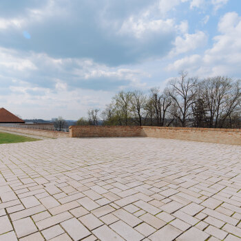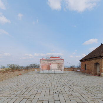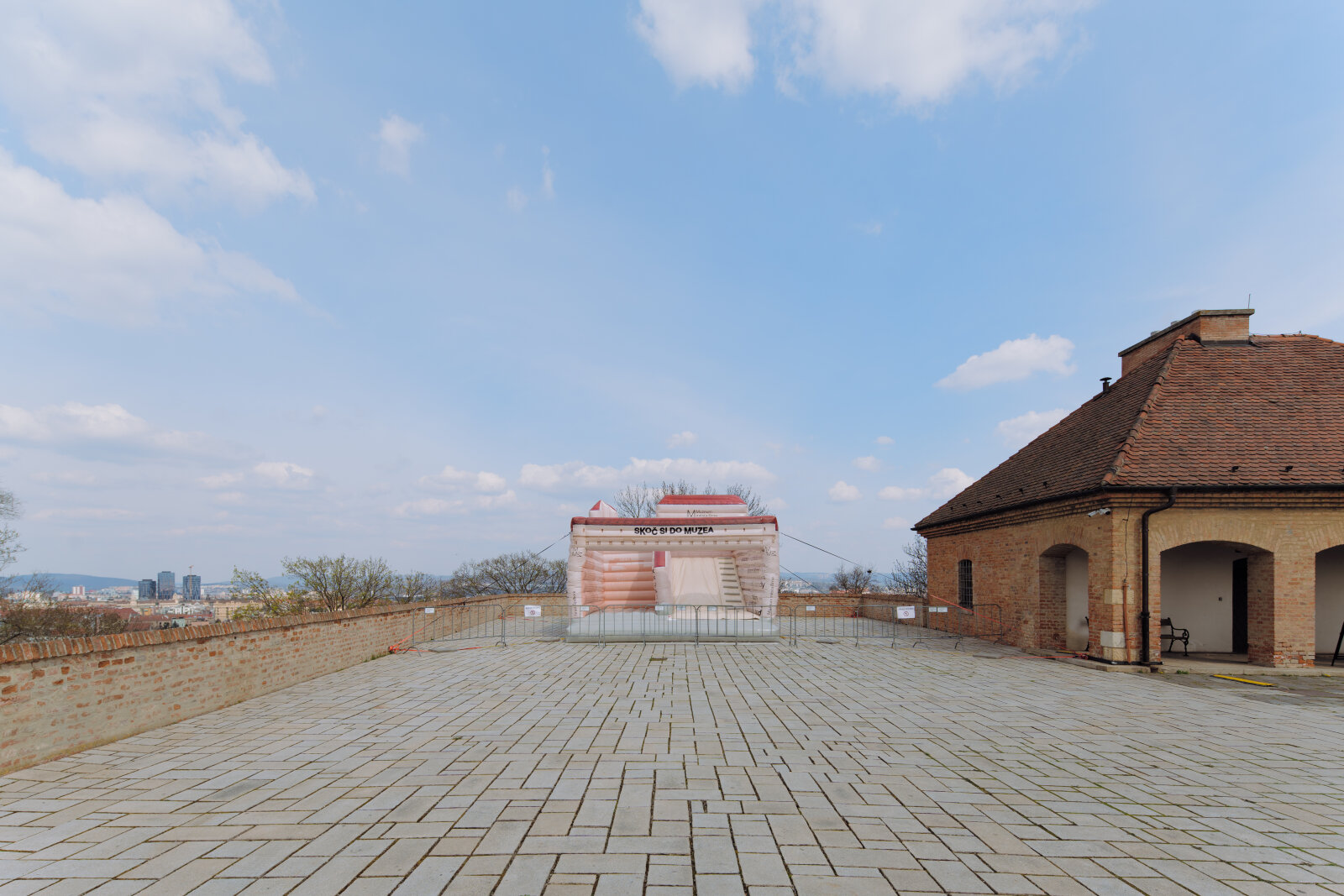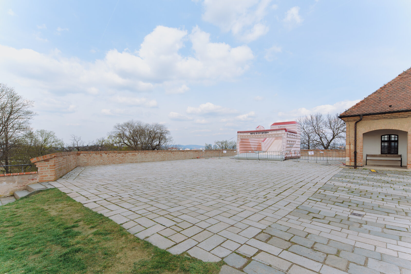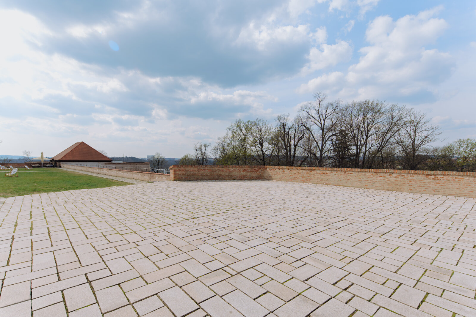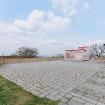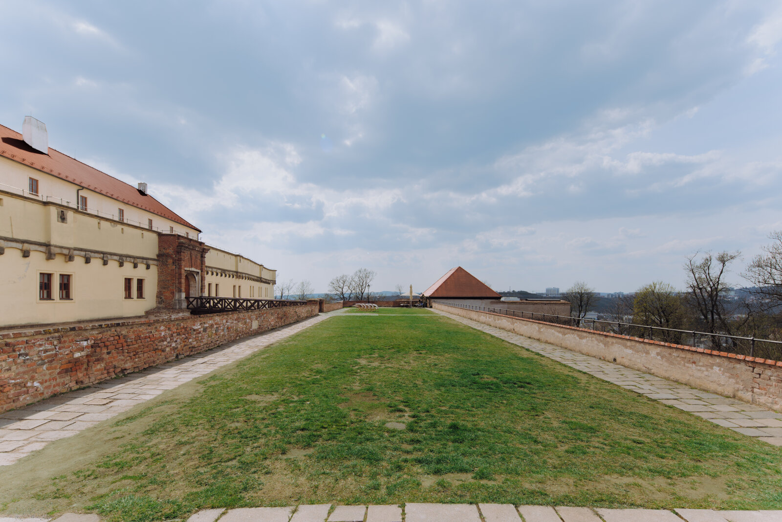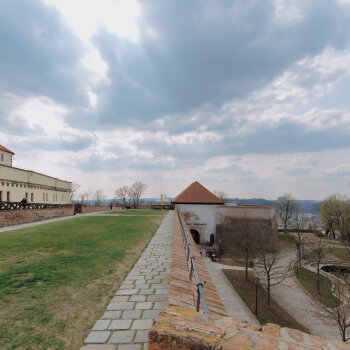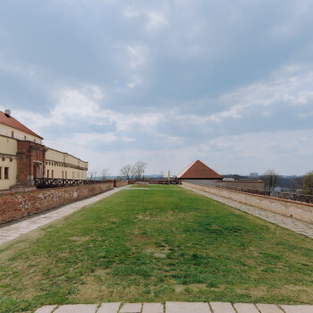 Historická pevnostní plošina s výhledem na město a zeleň Špilberského parku.