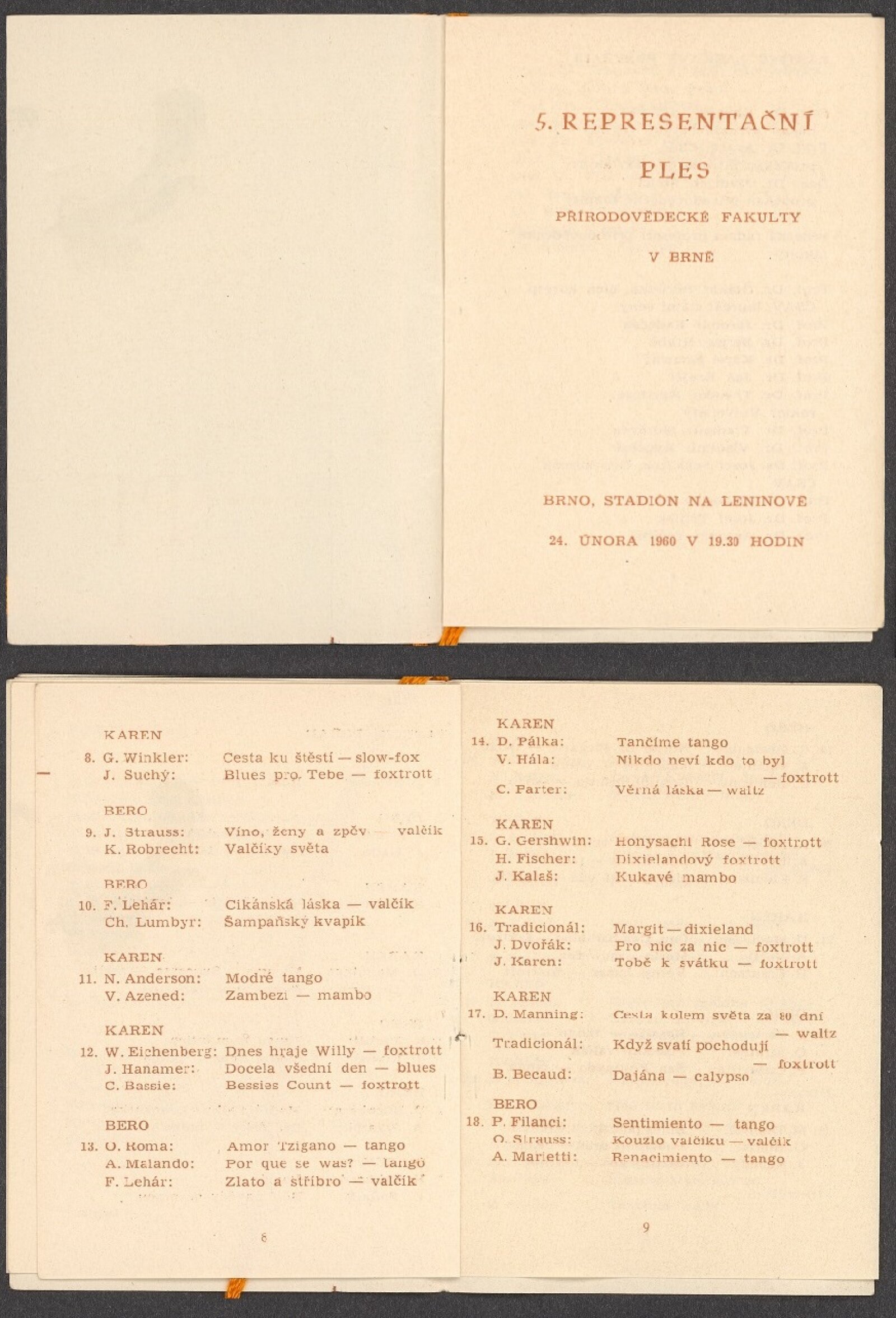 Nedávnou akvizicí jsme však do sbírek darem získali několik tanečních pořádků z let 1956 – 1962. Jedná se o pořádky plesů tehdejší Fakulty inženýrského stavitelství Vysoké školy stavitelství a Přírodovědecké fakulty University J. E. Purkyně.