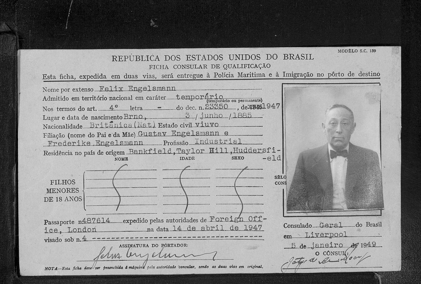 Felix Engelsmann se narodil 3.6.1885 v Brně. Jeho otec Gustav (1853–1929) se narodil v maďarském Gyöngyösu a matka Friderika (1860–1933) v Novém Bydžově. Gustav Engelsmann byl obchodníkem se sukny, který v roce 1885 vstoupil v Brně jako veřejný společník do firmy na výrobu vlněného zboží Heinricha Brücka, sídlící na ulici Cejl 32. S příchodem nového společníka firma vzápětí změnila název na Brück & Engelsmann, kterýžto název přetrval nejen po úmrtí Heinricha Brücka v roce 1905, ale firma jej v západní Evropě používala dál i během druhé světové války.